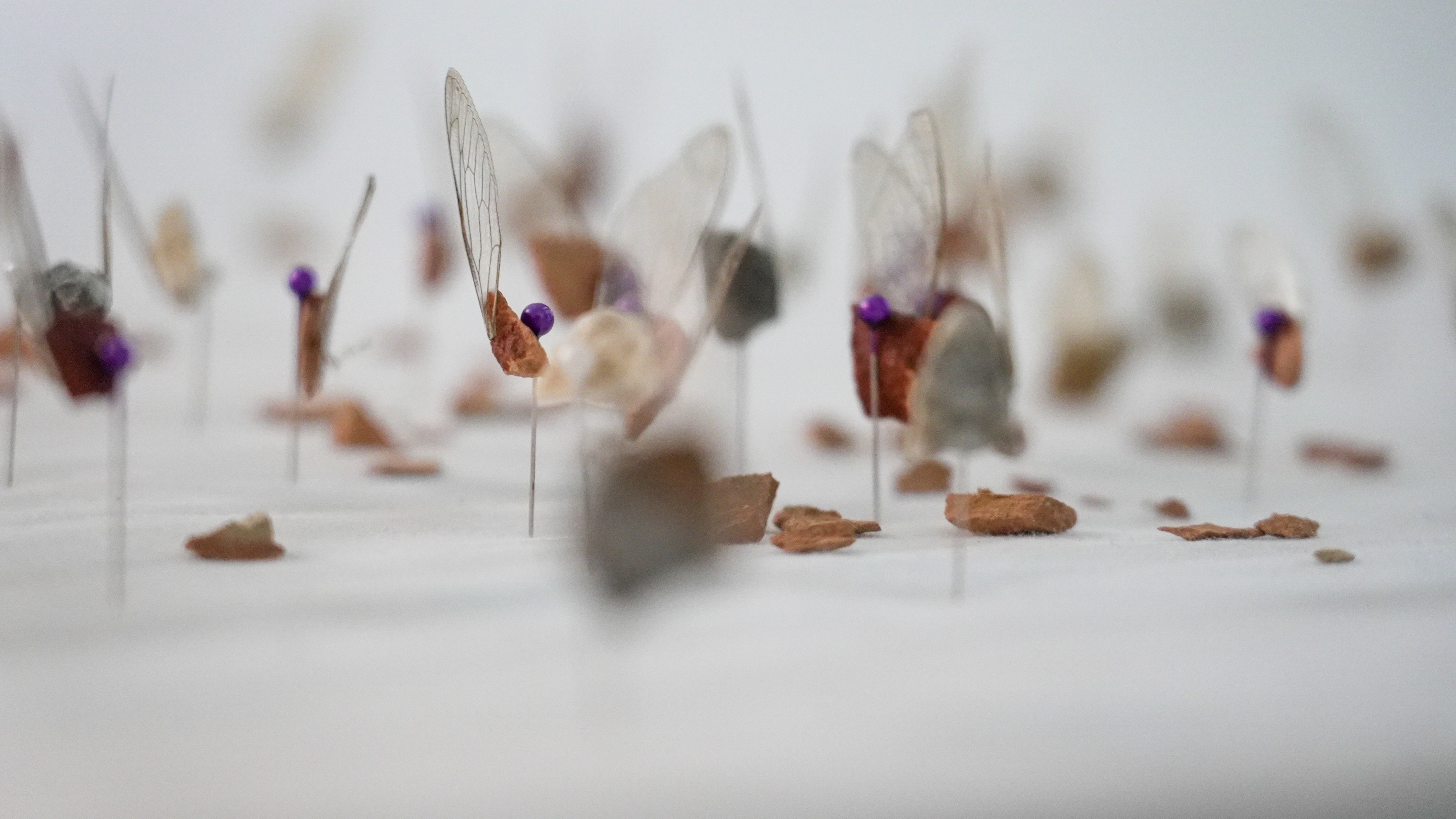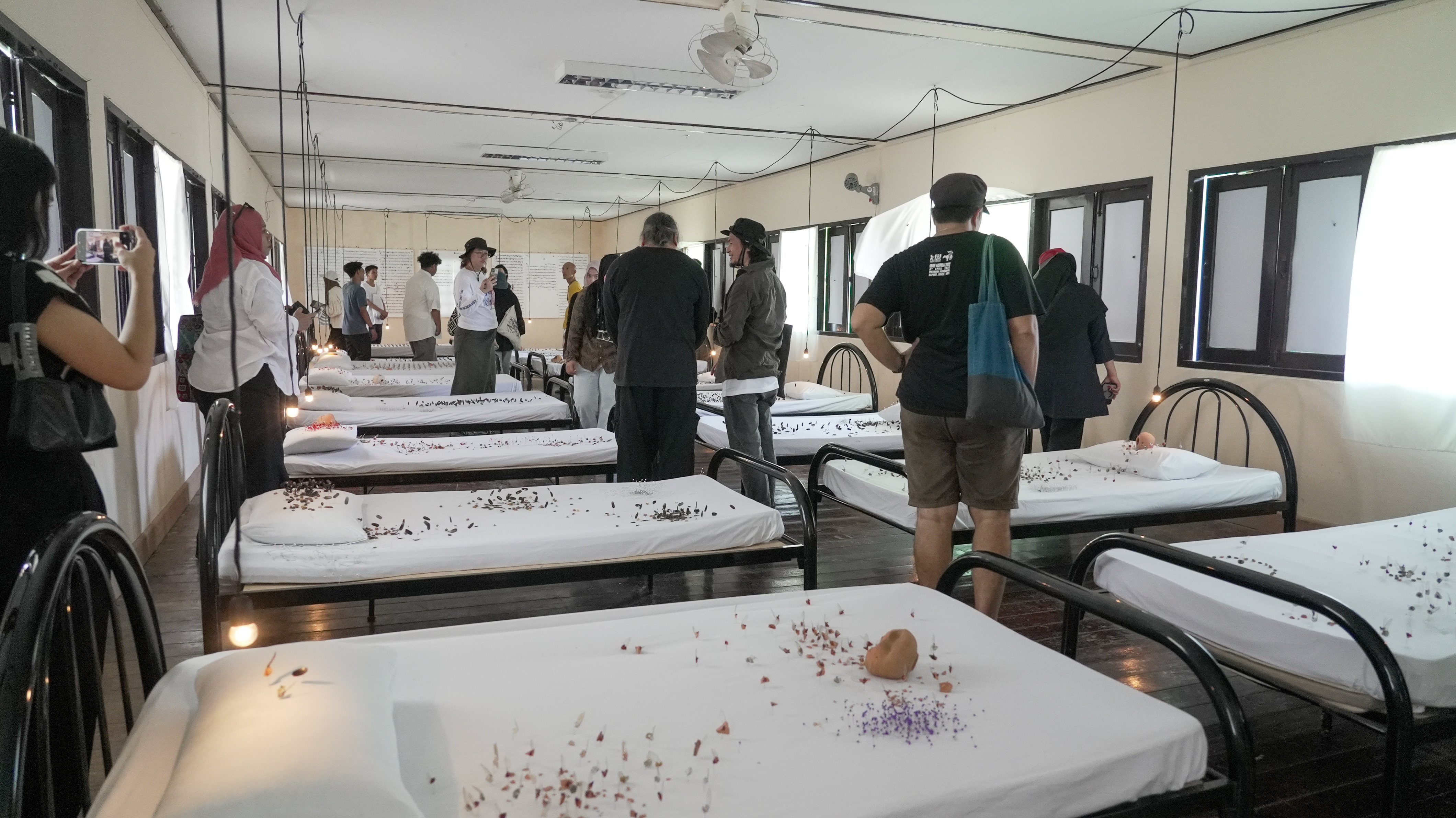 タイ深南部で最古参の現代アーティストPichet Piaklin(ピチェット・ピアクリン)は、白いマットレスの上に昆虫の羽や小石、陶器の破片などを並べた《The body and the disintegration of the worthless soul》を発表。傷ついた市民の心体を癒し、落ち着かせる安全な空間をイメージしている。