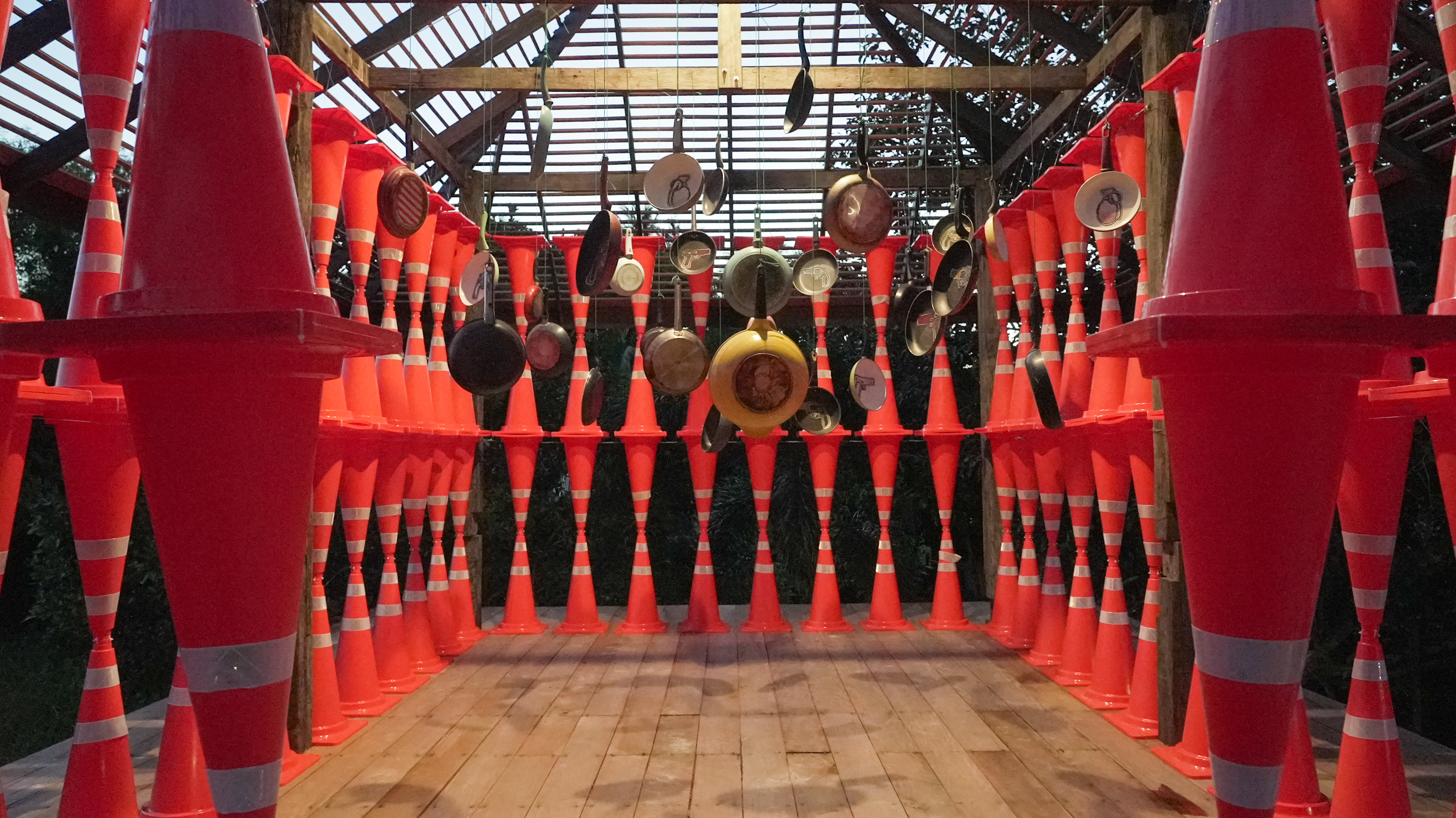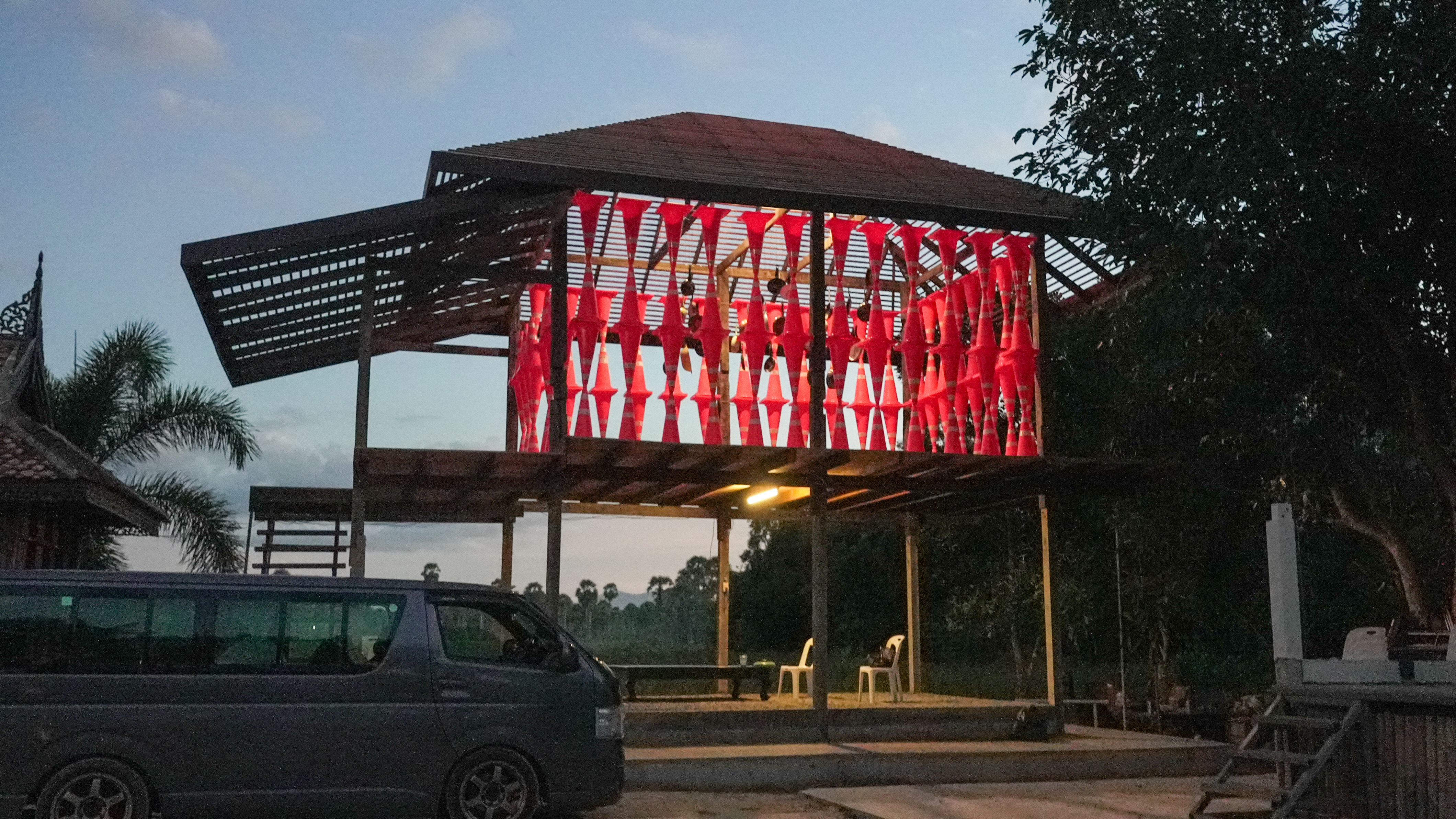 会期中のPatani Artspaceでは、同アートスペースの代表でタイ深南部のアートシーンを牽引する最重要ムスリムアーティストのひとりJehabdulloh Jehsorhohの作品を見ることができる。これまでタイ軍による暴力や弾圧をテーマにしてきた彼は、伝統的なマレーの建築家屋をアシスタントらとゼロから建築し、パッターニーでは安全のシンボルとなっているカラーコーンを組み合わせた新作《Structure and emotional debris of insecurity》を発表。