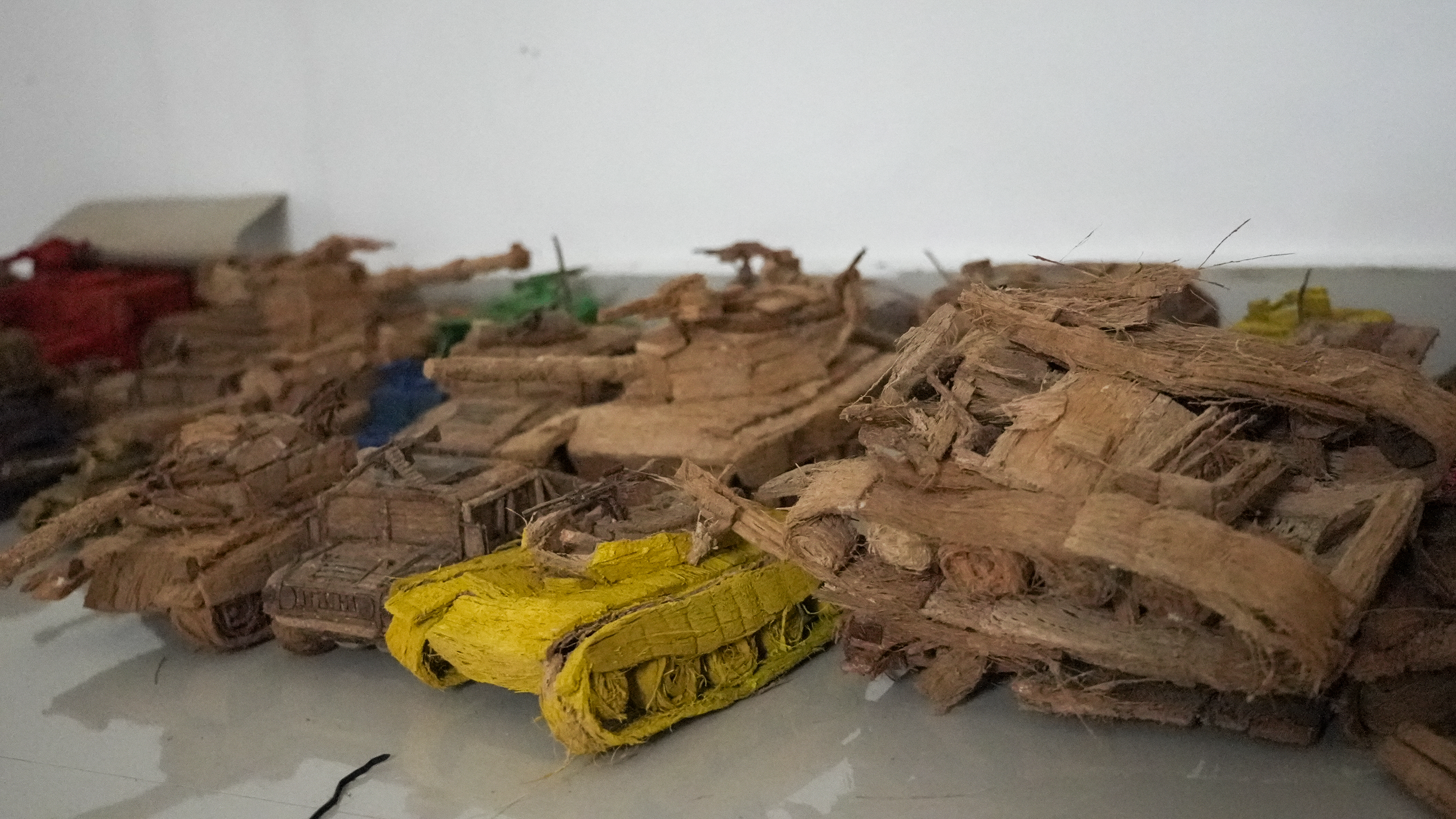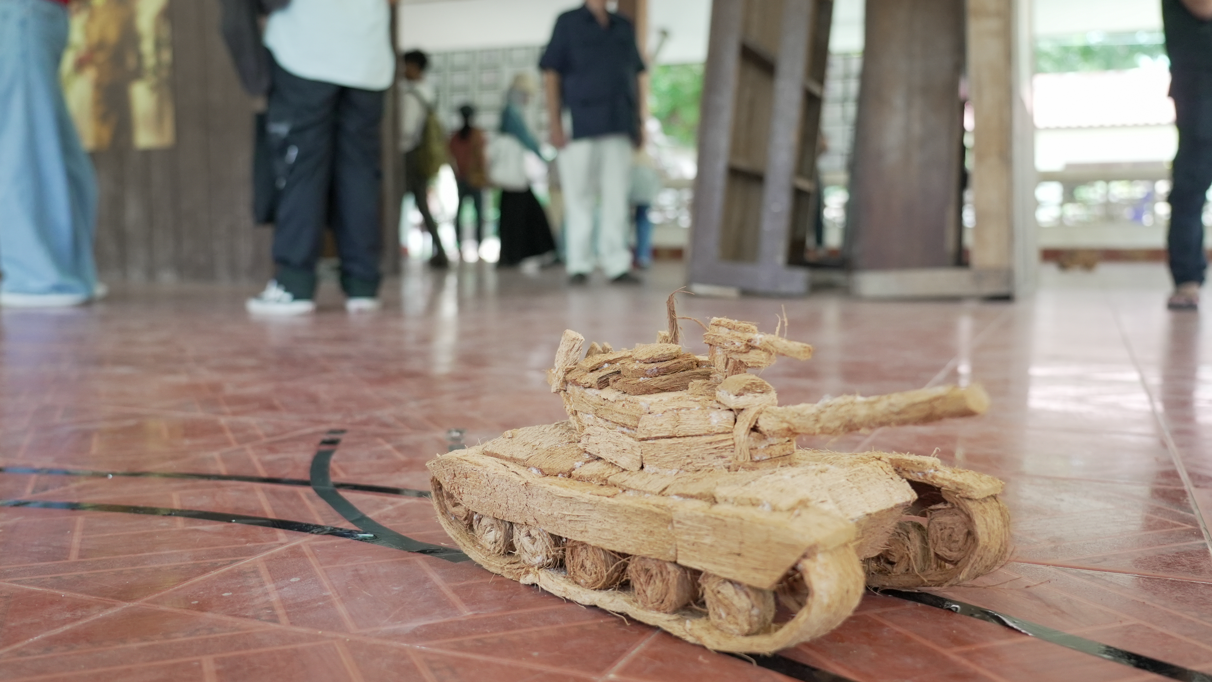 タイ深南部のアーティストたちがほかの地域の作家たちと異なる点は、その表現が非常に強い政治性を持っていることだ。モチーフは彼らが日常的に触れている爆弾や銃火器、戦車、軍であることが多い。