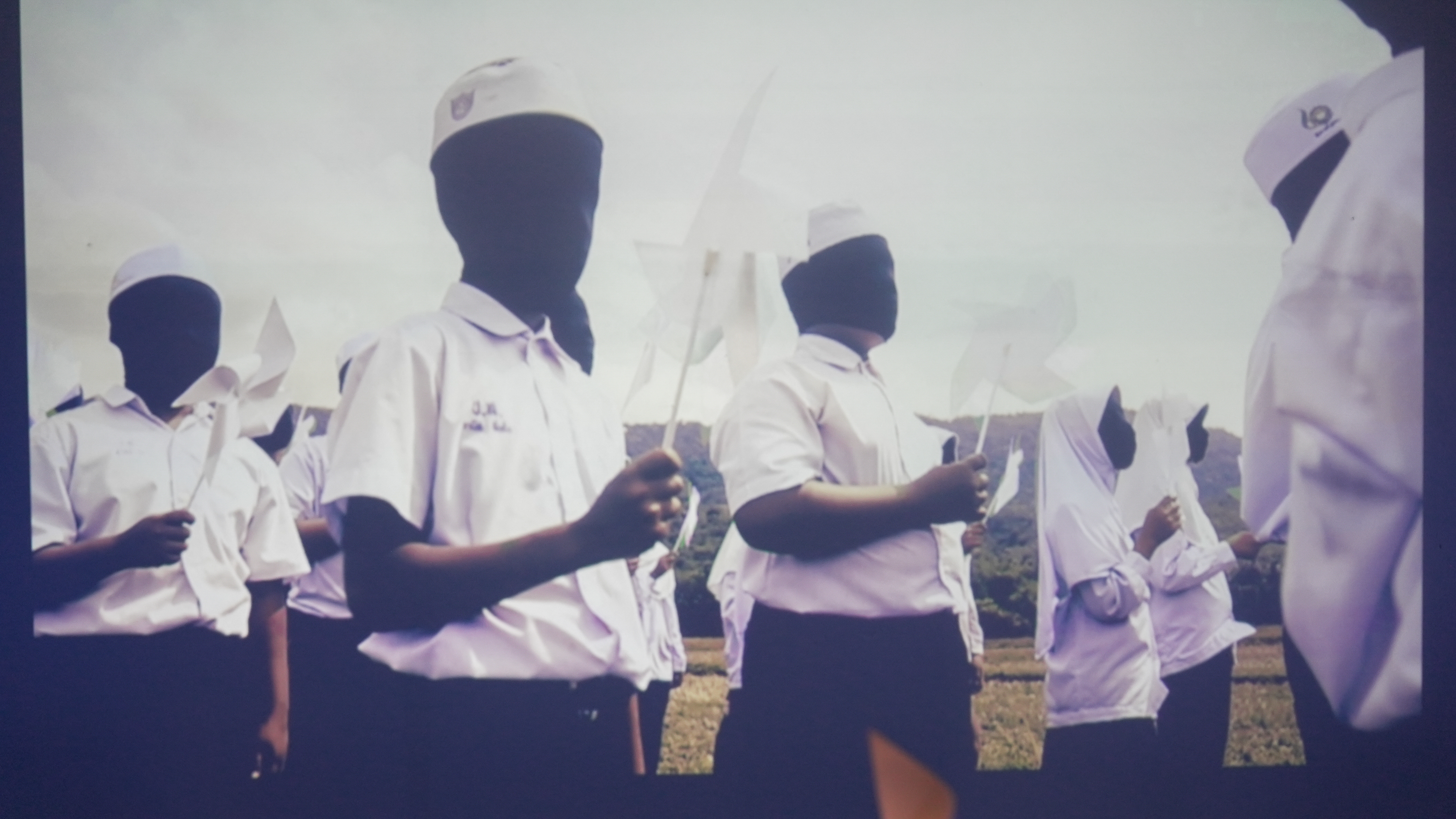 新世代のムスリムアーティストWanmuhaimin Etaela(ワンムハイミン・エサエラ)は、学習机と椅子でつくられたバリケードの奥に、平和や希望を象徴する紙の風車を持ったイスラム教徒の学生らが行進するヴィデオインスタレーション《PERARAKKAN Baling-baling kertas》を発表。暴力を経験した人々に希望と励ましを与え、平和な社会の願いを空間に反映させた。