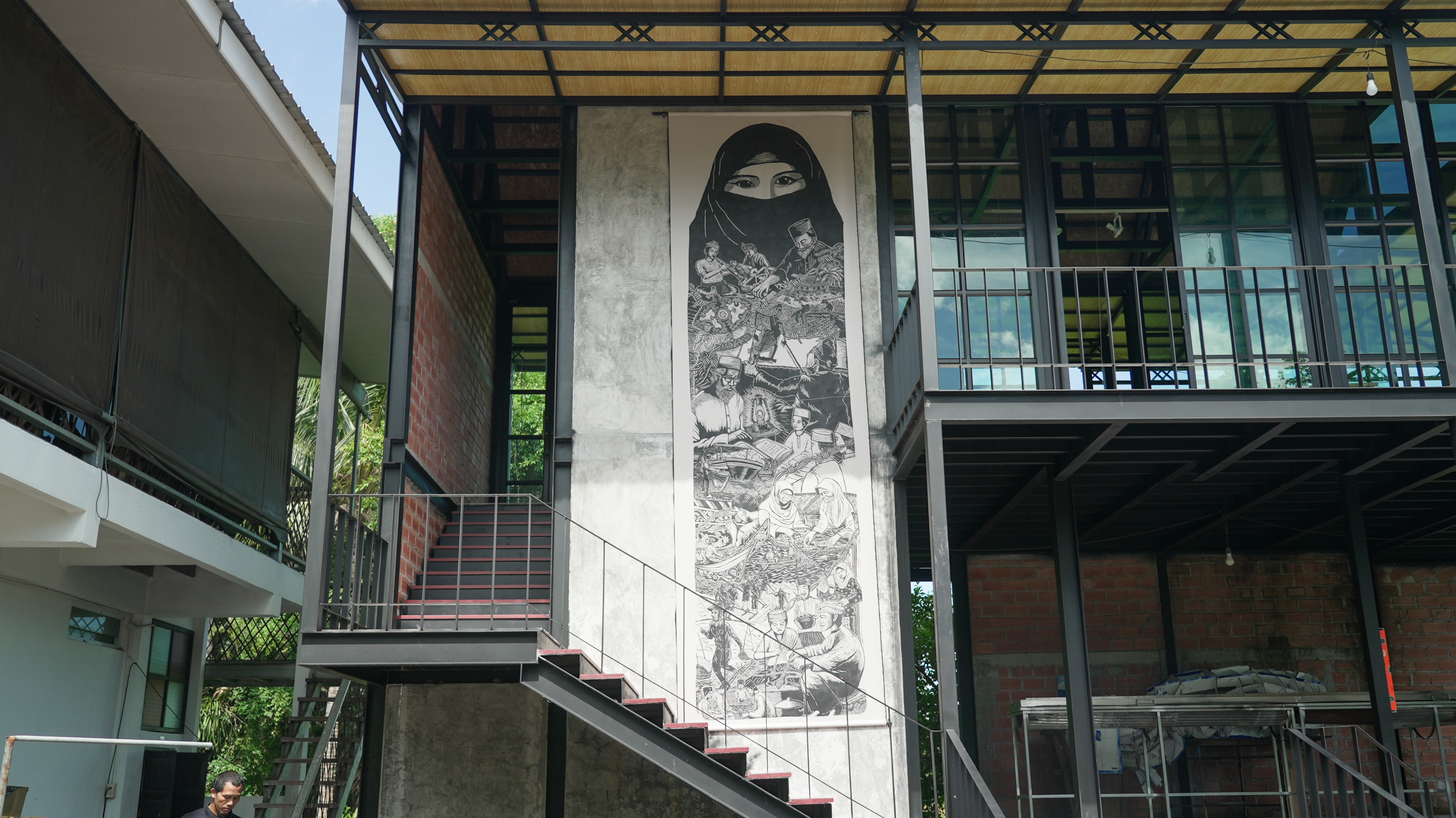 2012年にパッターニー郊外に設立されたスペースPatani Artspaceは、タイ深南部のアーティストたちがつねに集っている本拠地だ。「アチャンチェ」の愛称で慕われているムスリムアーティスト、Jehabdulloh Jehsorhoh(ジェアブドゥラ・ジェソーホー)が代表をつとめる。アートスペースの建設時は家族とスコップで土地を掘り起こすところから始まった。いまでは展覧会を開催するギャラリースペースのほか、作家の関連グッズを販売する売店、カフェ、レジデンススペースなどが併設されている。