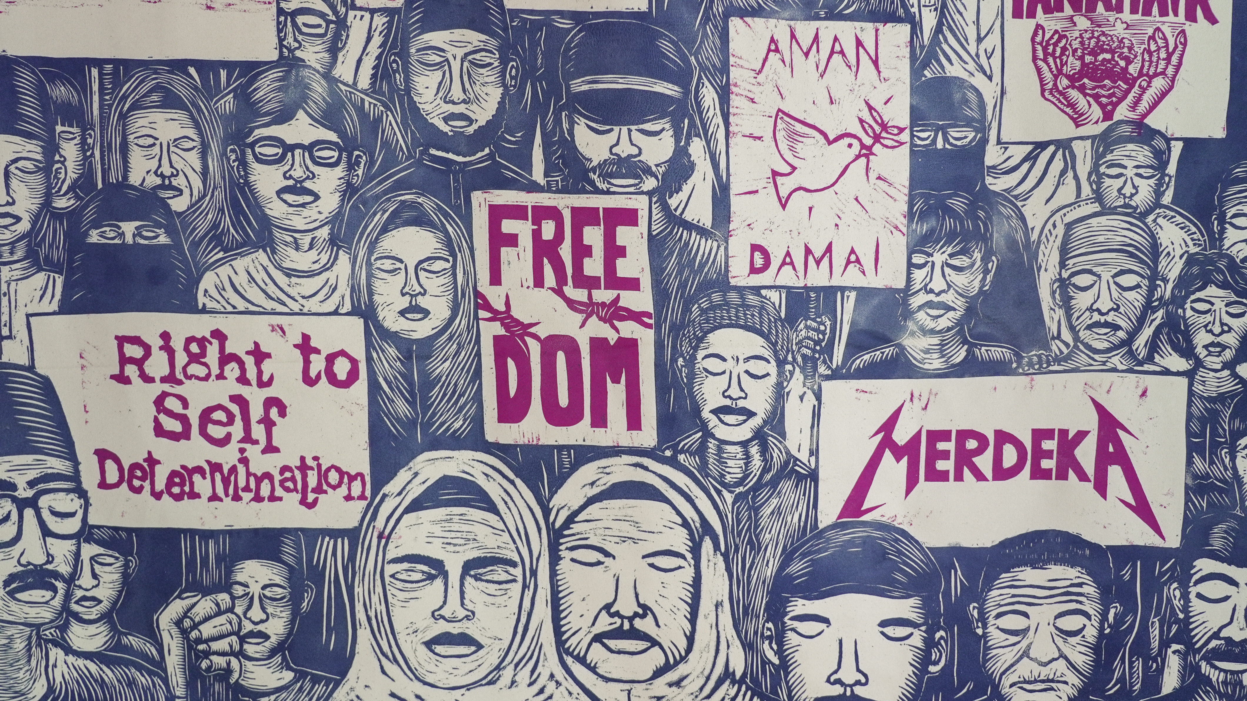 世界各地の展覧会に参加してきたマレーシアの版画コレクティブ Pangrok Sulap(パンクロック・スゥラップ)は、パッターニーで地元住民らと触れ合いながら滞在制作した5mの大きな版画作品《Bumi Patani》を制作。版画を通して、タイ深南部の文化、伝統、そして人々を悩ませ続ける根強い対立を表現している。