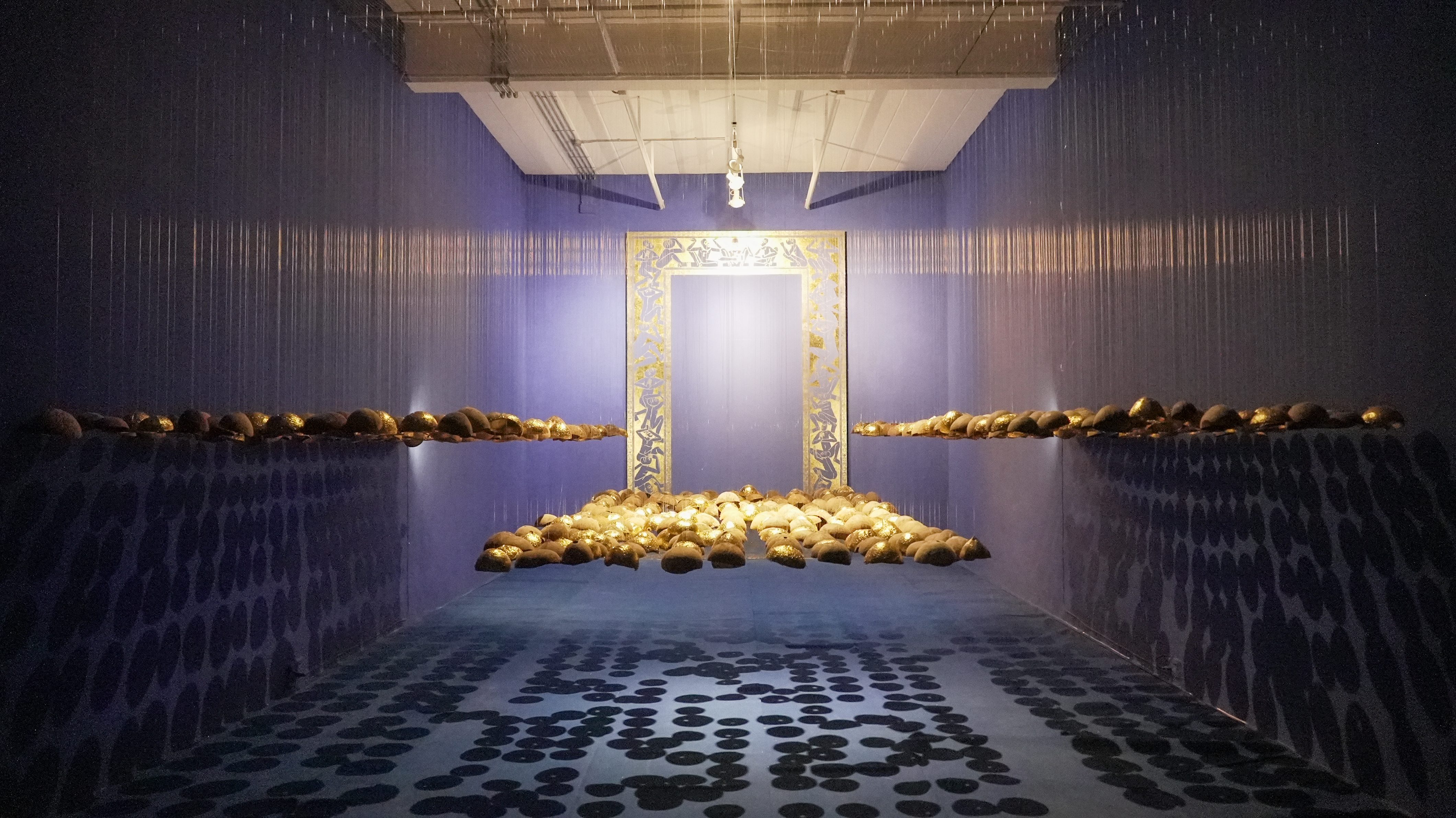 仏教徒でありながらムスリムアーティストたちとも親交が深いアーティストKorakot Sangnoy(コラコット・サンノイ)は、金箔をあしらったココナッツを青い部屋に吊り下げた《Low ceiling》を発表。社会を統治する権力と、支配された市民の不平等の構造を展開した。