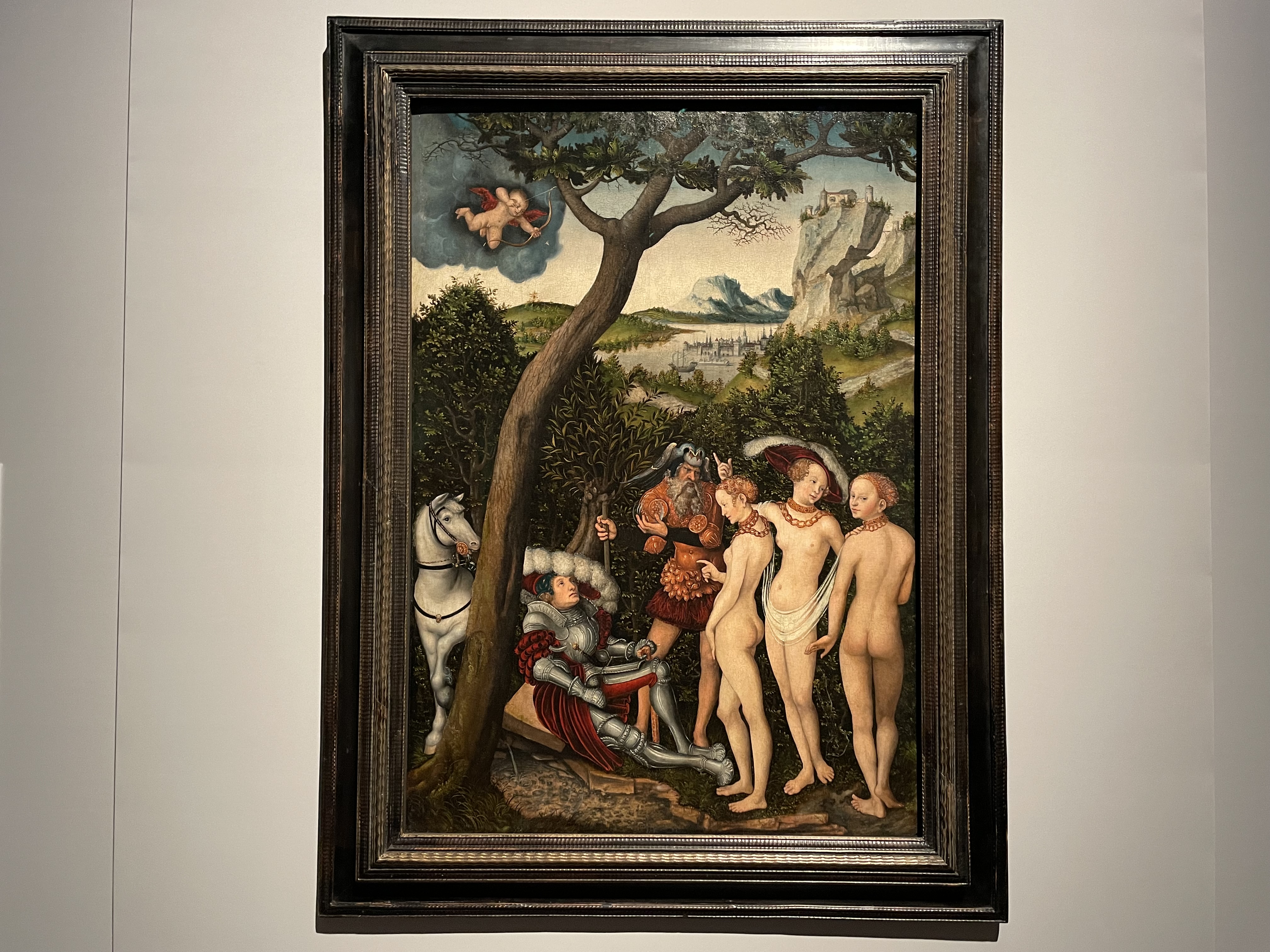隣の小部屋には同時代の北方ルネサンス、すなわちディーリック・バウツやヘラルト・ダーフィットといったネーデルラントの主要画家や、ドイツ出身のハンス・ホルバイン(子)、ルカス・クラーナハ(父)の作品が展示されている。クラーナハの《パリスの審判》(1528年頃)は、華奢な体つきでエロティックな裸婦像を、神話の形式を借りて描いた画家のおなじみのモチーフだ。