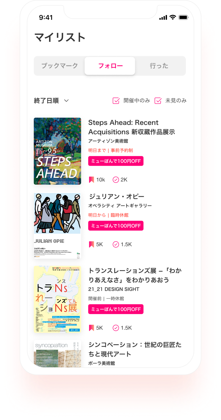 お気に入りの美術館・ギャラリーをフォローすれば、開催中の展覧会の見逃しを防げます。
