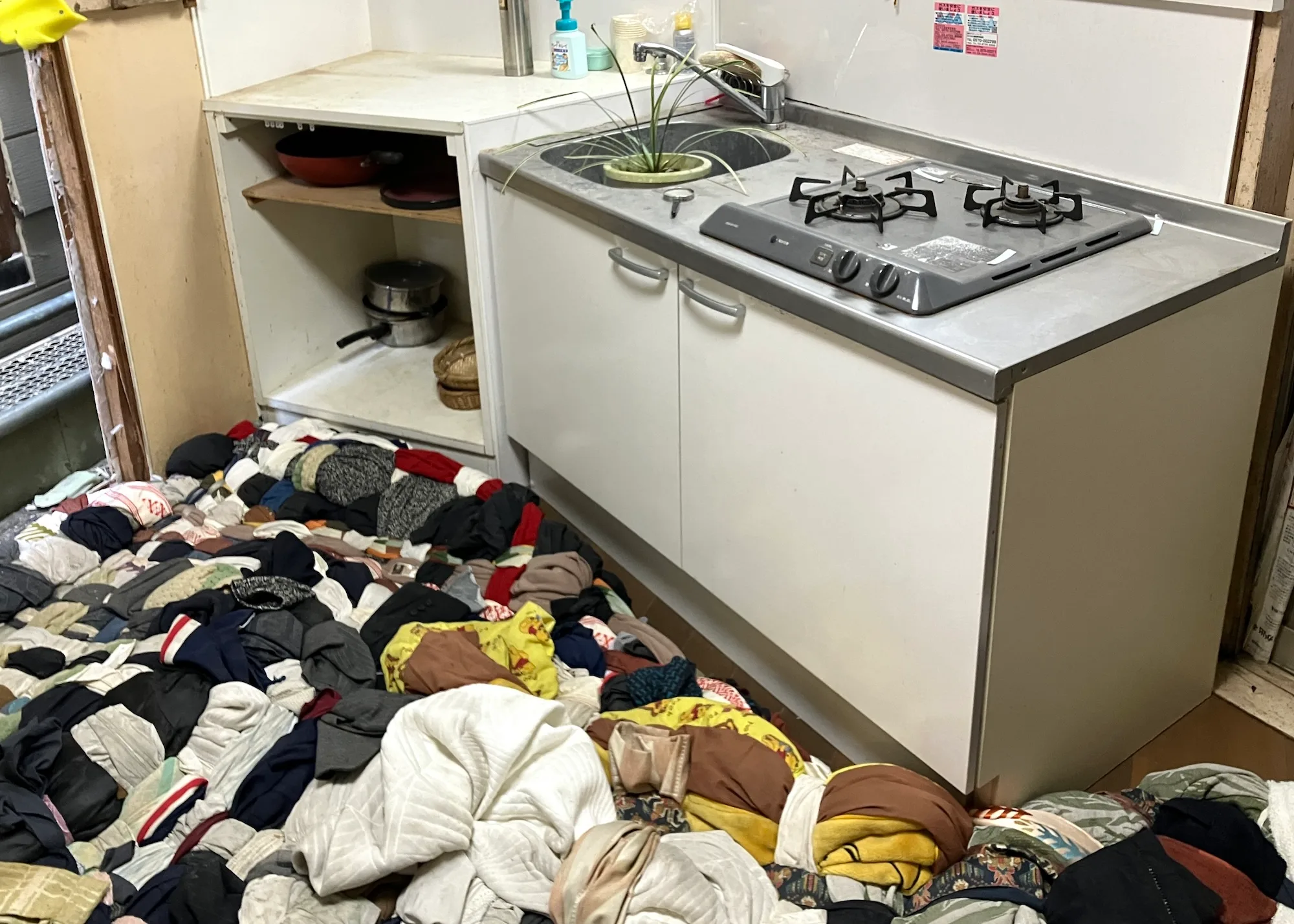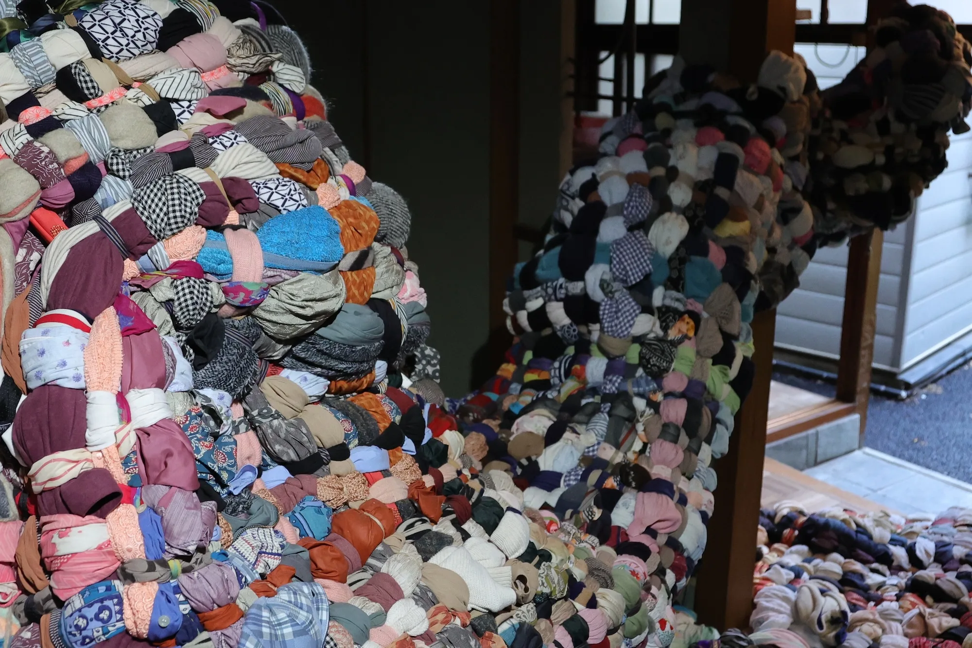 大竹舞人は展覧会会場となった6棟の建物に残された衣類やカーテンなどの布を、改変することなくすべてそのままの状態で編み上げた。編まれた布は床を埋め尽くすだけでなく、縦方向へも伸びていき、まるで生き物のような立体造形を形作っている。一つひとつ異なる布の柄や質感から持ち主の体温が伝わってくるようだが、来場者は布の上を踏みしめて次の部屋へと進んでいく。