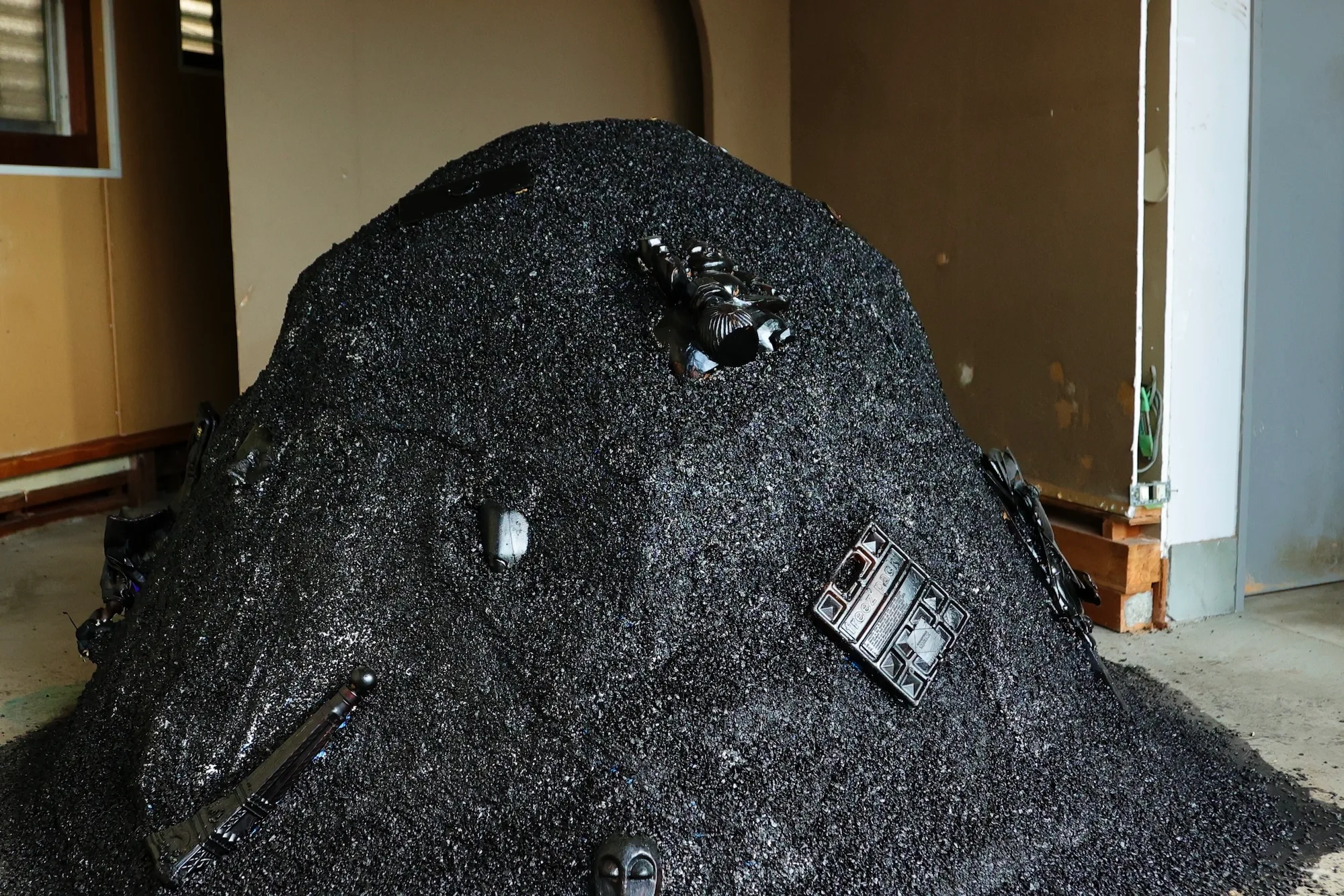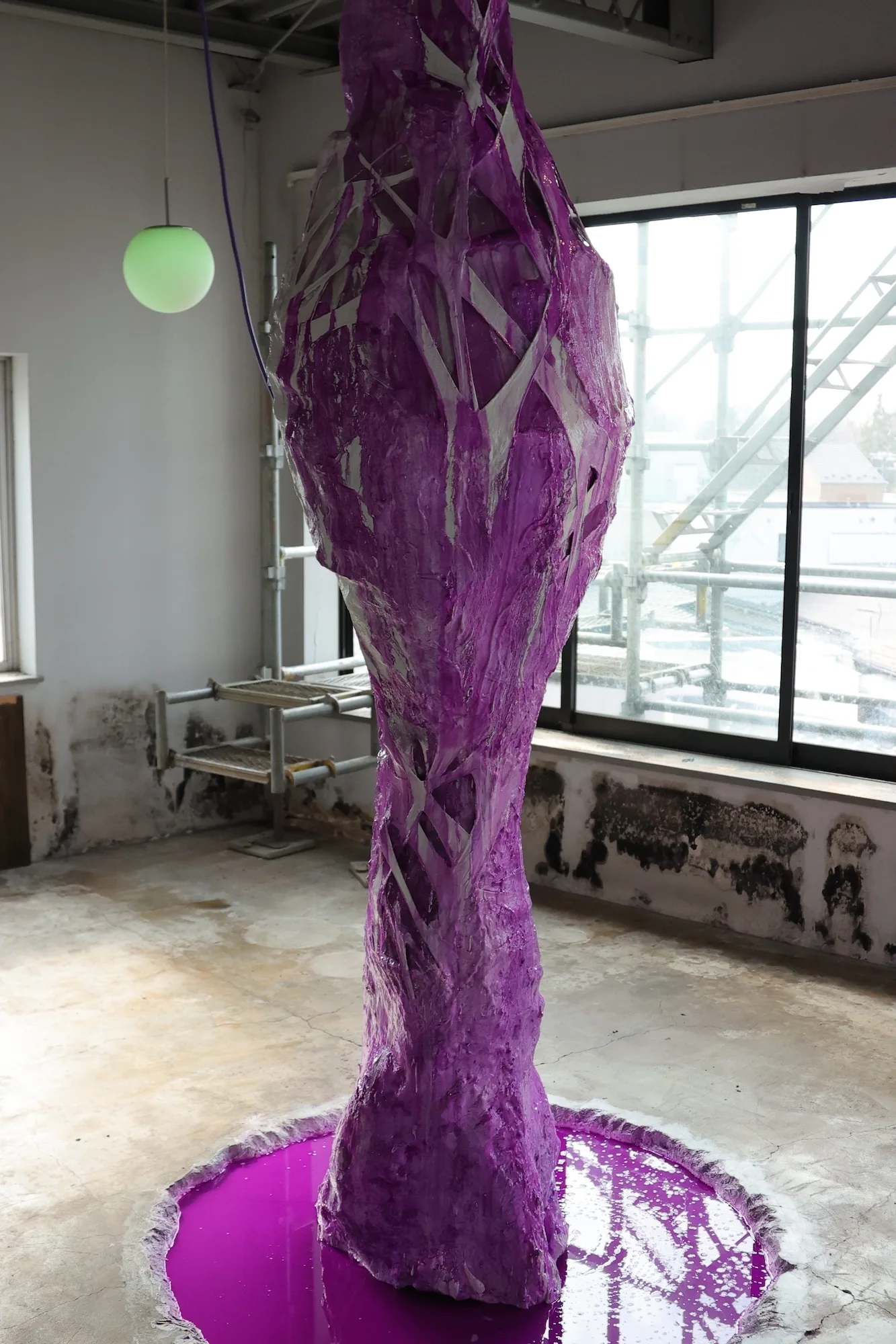 同じ建物の3階と4階に展示されているのは宮原嵩広の立体作品《Syncretic object》。黒く塗り固められ、アスファルトの山に埋もれる残置物には、羽子板や大黒様の彫刻らしきもの、エッフェル塔の置き物、旧型の携帯電話など、それぞれに宿るストーリーや受け継がれてきた文化を想像させる品々が、時間が凍ったかのように原型をとどめたまま残っている。いっぽう残置物が取り払われ、シンクだけが残る4階の空間に出現した紫色の沼とそこに聳え立つ彫刻は、ふつふつと沸く生命力や人間の欲望を感じさせる強い印象を放っていた。