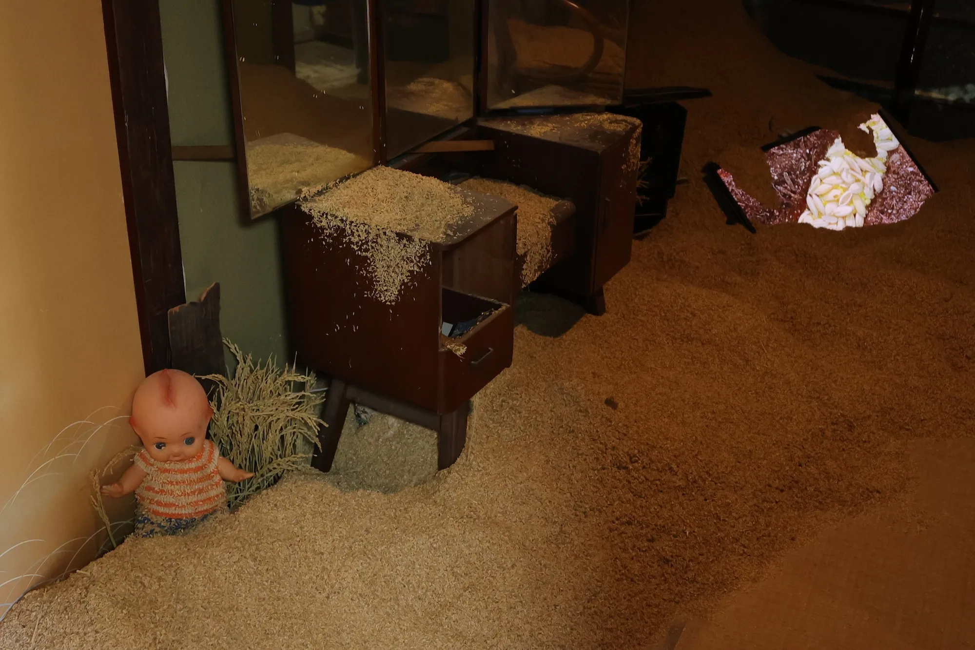 2階へ戻り、足場を伝って別の建物へ。何かが流れるようなグツグツとした音とともに薄茶色に覆われた和室が出現する。副島しのぶの《Husk》は映像作品と無数の籾で構成されるインスタレーション。籾は古い畳の上のみならず、部屋に残された鏡台や押入れの布団の上まで侵食し、籾に埋もれたスクリーンと引き戸には無数の籾が上へ下へと流れていくストップモーションアニメが映し出されている。延々と動き続ける籾は生きた人間の血管のようでもあり、積み重ねられた時間とそこにあった生を呼び覚ます。