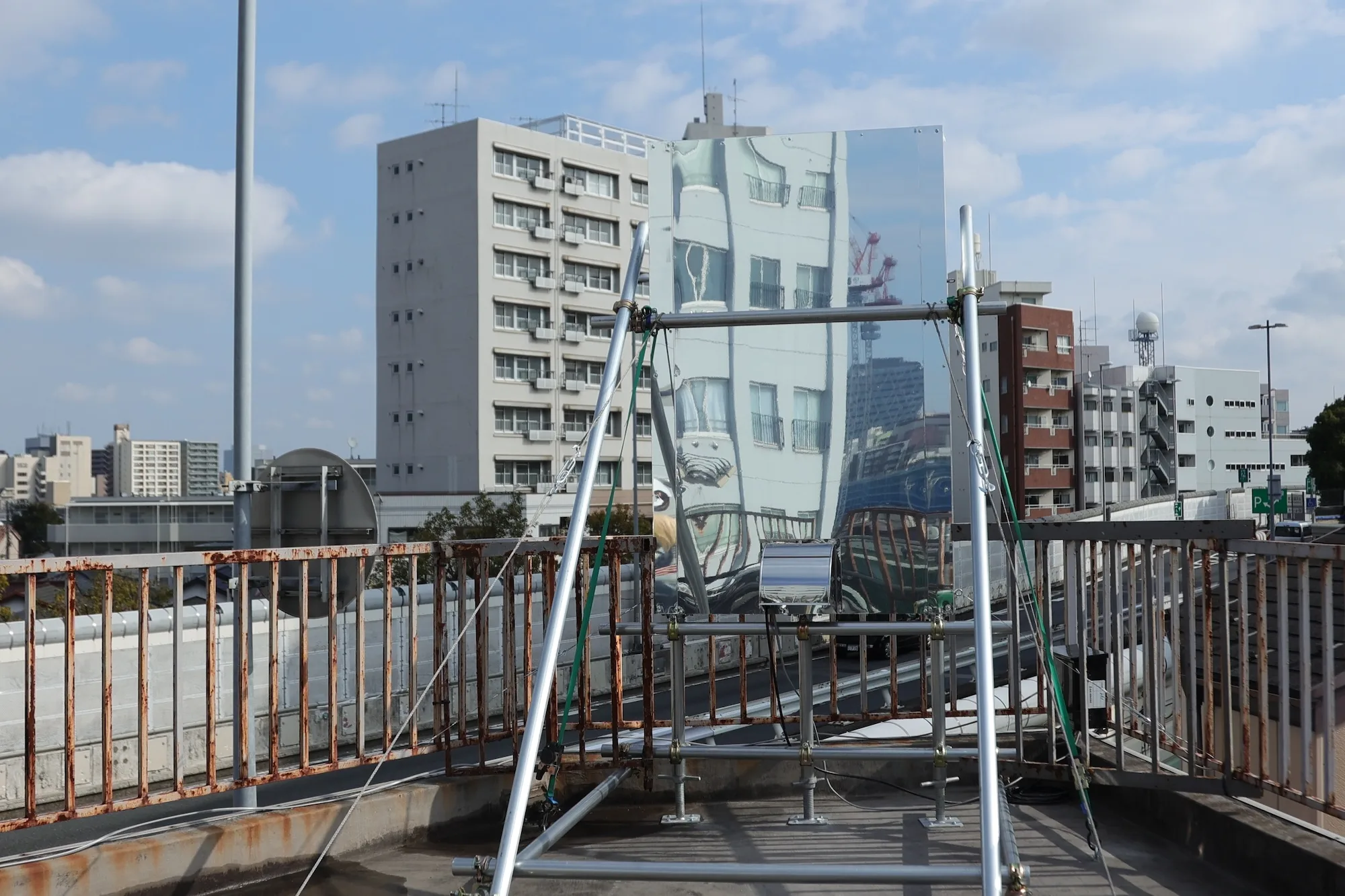 4階の窓から外へ出て、細い階段の足場に足がすくみそうになりながら屋上へ上がる。首都高を見下ろす屋上に展示された加藤広太《あなたにではない、何かに向けて》は、トランスミッターとラジオ、大きな鏡などで構成される。屋上の角に置かれた鏡の裏はディスプレイになっているのだが、画面は首都高に向けられているため、会場からは見ることができない。画面には、首都高を走る車の車内から展示会場を映した映像を引き伸ばしたものが映し出されているのだという。FMトランスミッターからは作品解説が流れており、車内ラジオでこの周波数に合わせると、首都高で会場前を通過するあいだだけこの音声を聴くことができる。