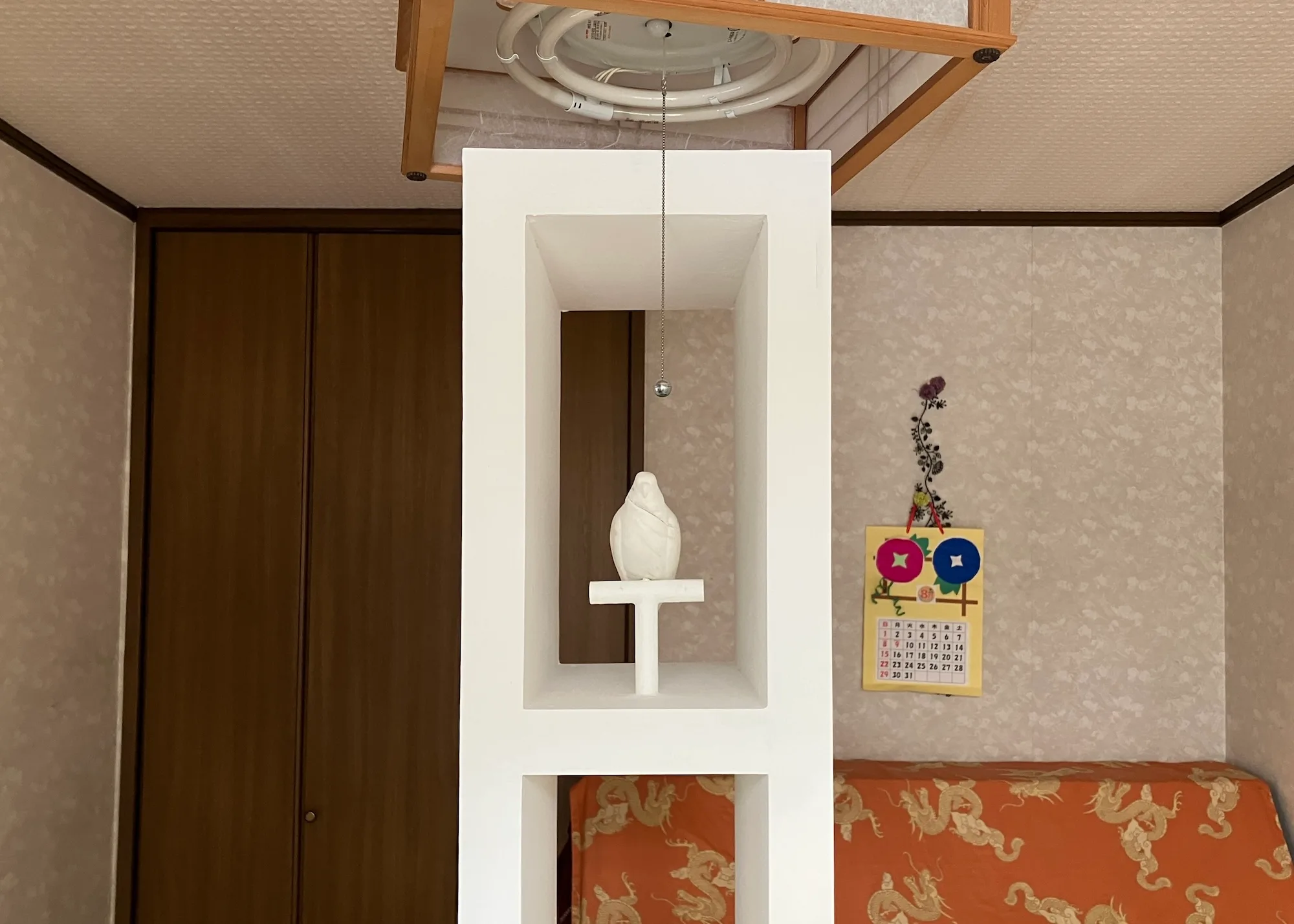 これまで見てきた部屋とは異なり、いま現在も人が住んでいる部屋に来てしまったのではないかと意表をつかれたのが横井菜々《風をよむ》の展示だ。今日干したのではないかと思うような生活感のある洗濯物がバルコニーや室内のカーテンレールに干されており、プライベートな空間にうっかり入ってしまったようで落ち着かない。いっぽうで部屋の中央で静かに外を見つめる白い鳩の彫刻は、異物であるはずなのに見逃してしまいそうになるほど不思議と部屋に溶け込んでいる。