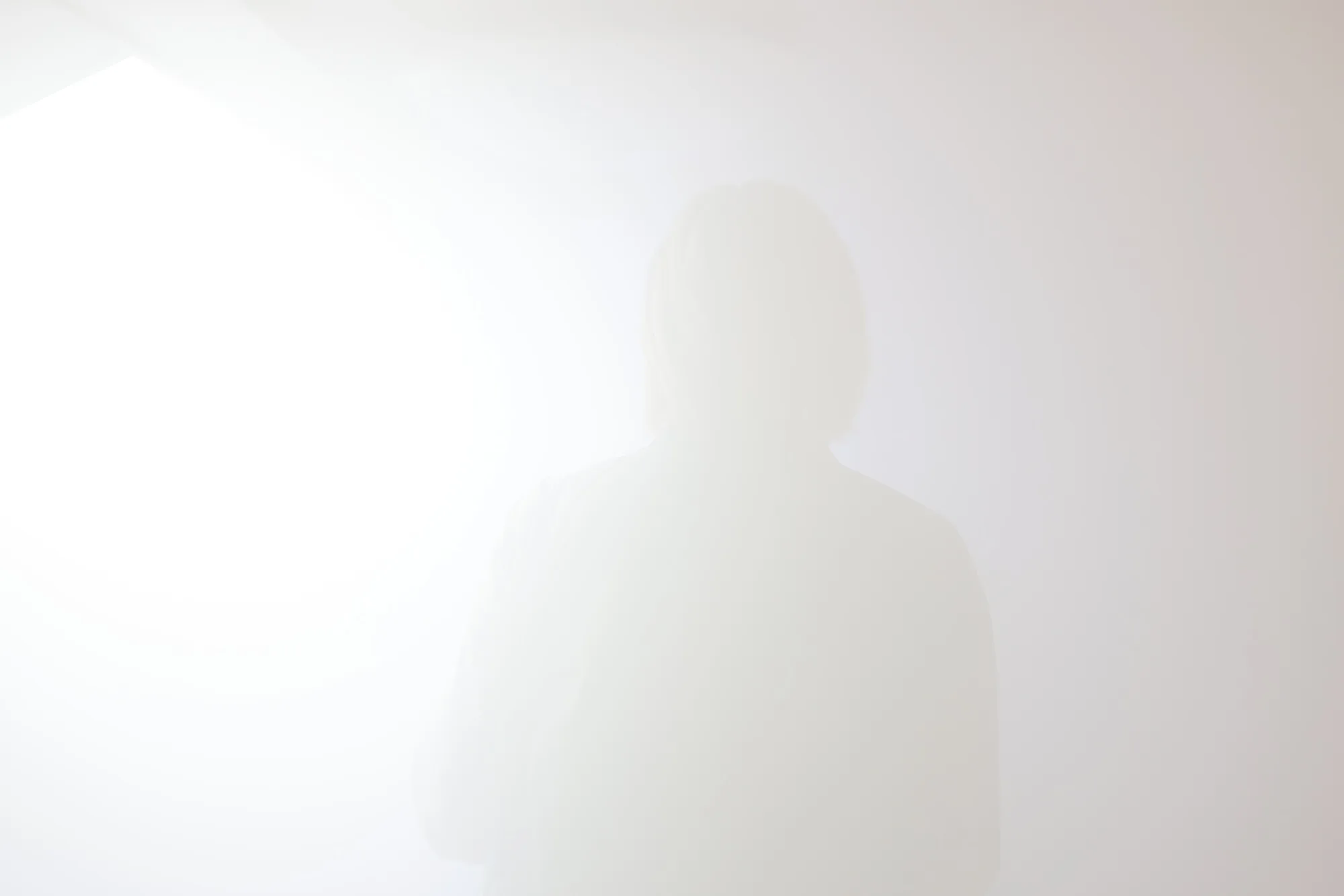 3階に上がろうとすると何やら霧のようなものが立ち込めてくる。部屋に入ると霧が充満した室内は真っ白でもはや何も見えない。奥へと進んで目が慣れてくるとぬいぐるみや子供が描いたような絵などが視界をとらえ、自分はいま子供部屋にいるのだとわかる。Houxo Queは、本作《どうせいつかみんな忘れる》を「来たるべき忘却のための絵画」と位置付け、スマホで記録することもできず、鑑賞者の記憶も曖昧になってしまうほどの大量の霧で部屋全体を包み込んだ。