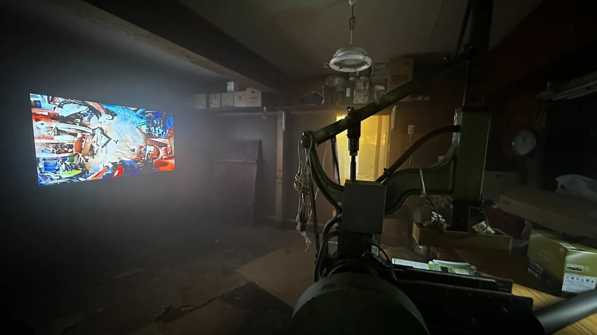 突如出現した霧の立ち込める部屋を抜けて何かの作業所のような場所にたどり着く。布施琳太郎のインスタレーション《寄生された君が代》は、この部屋に残されていた多数の製箱機から作家が「君が代」を詠み出していく様を映し出した作品だ。薄く霧が残る室内で、引き伸ばされ、途切れ途切れに歪んだ「君が代」が、どこか不気味に響き渡る。