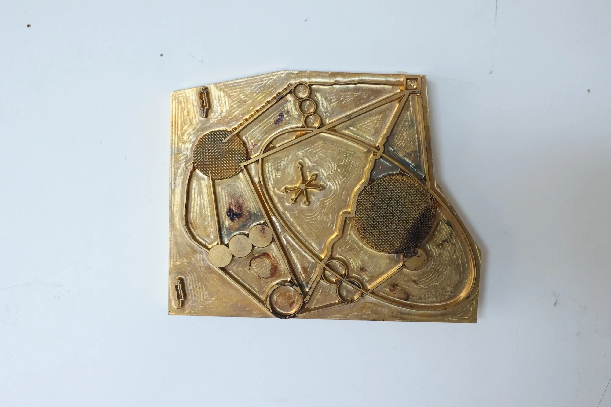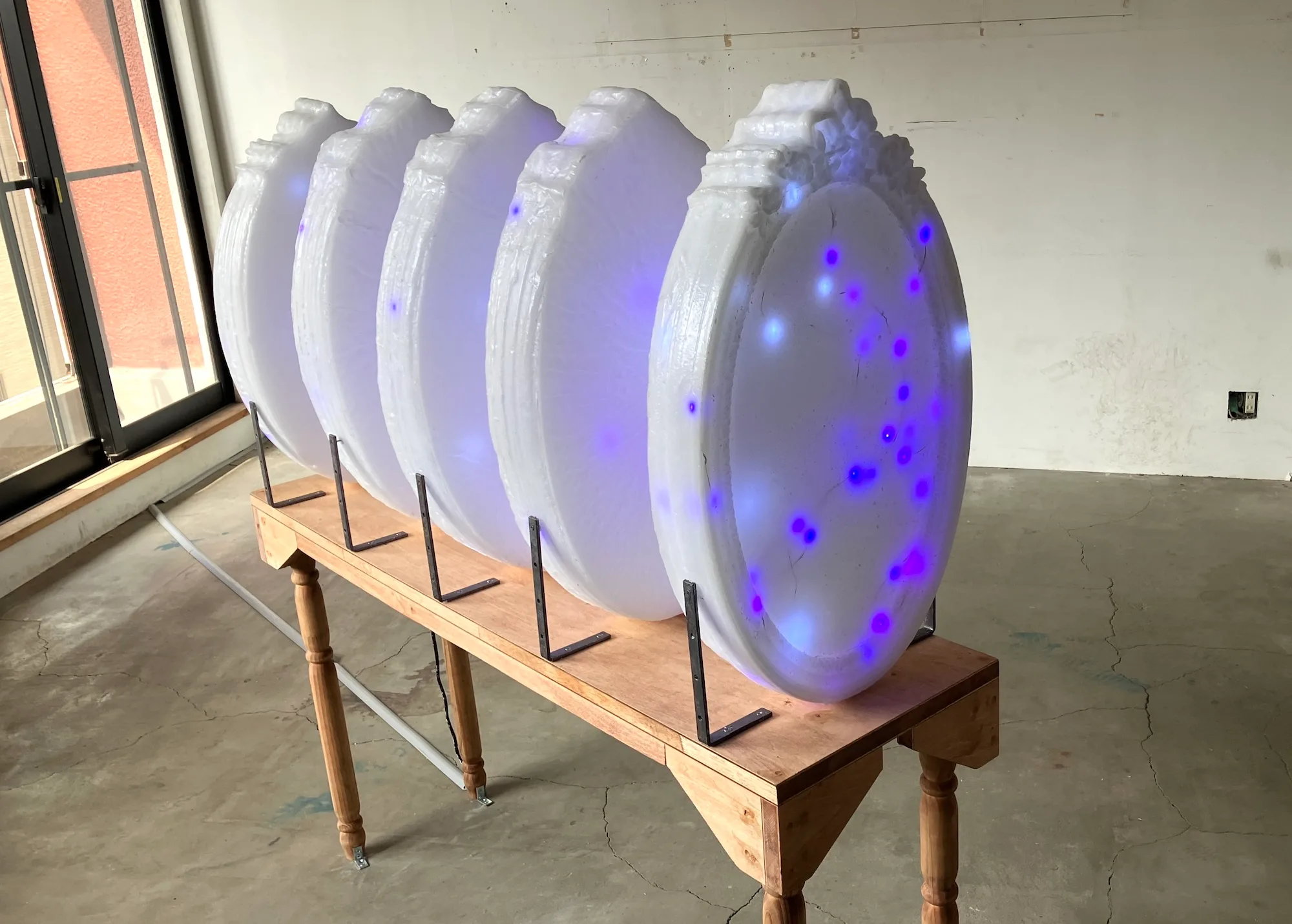 オフィスのようなコンクリート床のがらんとした2階の空間では、吉田山+ormの作品が展示されている。公私ともにパートナーである美術作家の藤井智也と高橋ちかやによるユニットormの《いつかの君たちの自画像》は、自身の子供が鏡に映る姿に笑いかける様子に着想を得たという作品で、パラフィンワックスで作られた白い鏡の内部で青い光が星座のように線を結ぶ。これに呼応するように吉田山の《We need to put a branding iron on it for this time to make it more memorable》では、真鍮で作られた焼印で会場中の壁に幾何学的な模様を残していく。