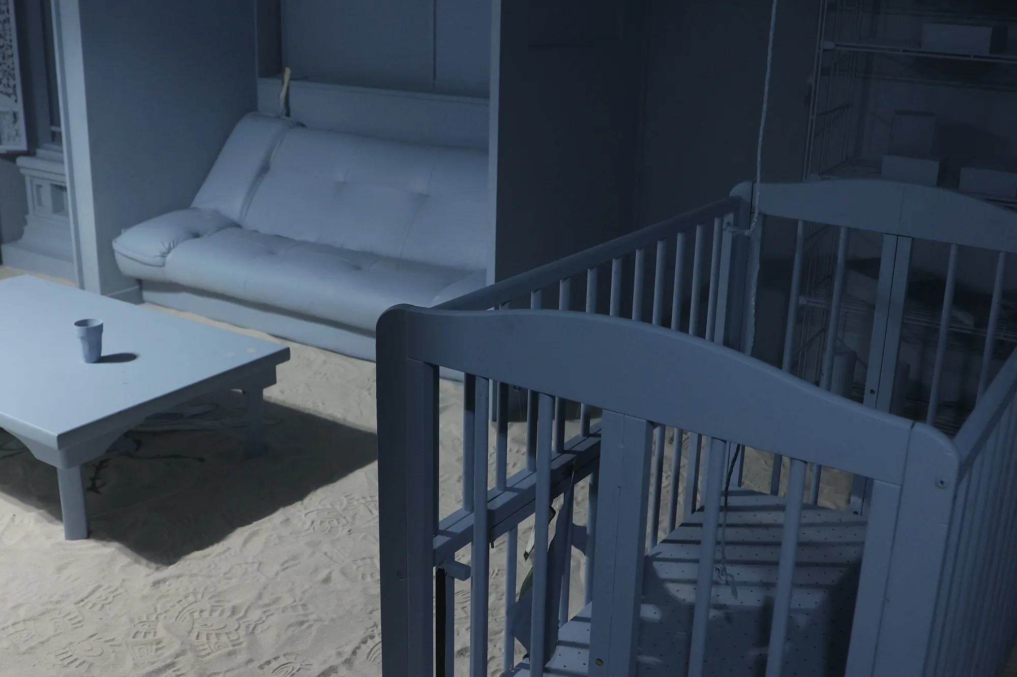 階段で2階へ上がると、今度は床が砂で埋め尽くされ、すべての家具がグレーがかかった青に塗られた部屋が現れる。小野まりえの《ゆめゆめいぬいぬ》だ。足元を覆う砂丘のように細かな砂の上で、自分の足跡も自分より前にここを訪れた人の足跡も残っては消えていく。部屋に残るパソコンやぬいぐるみ、仏壇、赤ちゃん用のベッドなどは、一色の淡い色に統一されることで持ち主の生々しい痕跡にベールがかかり、どこか現実と夢の狭間にあるような不思議な存在感を湛えている。