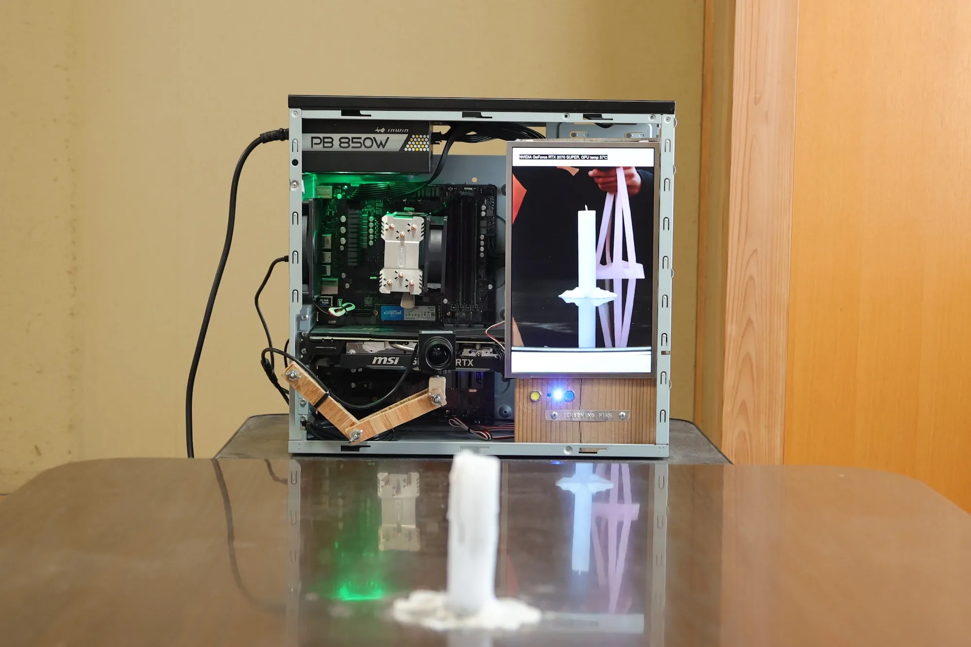 和室のちゃぶ台の上にポツンと置かれたロウソクは、高見澤峻介の作品《Screening Fire: The Past Is Alight》。古くは時計のような役割も果たしてたロウソクは、人間の時間感覚と関わりを持ってきた。火の消えたロウソクの前には、カメラがとらえた光景を生成系機械学習プログラムによって再認識して表示する装置が置かれている。プログラムはまだ炎があると認識するよう設定されており、来場者がロウソクの後ろに立つと画面の中の自分の前に映るロウソクはまだ火を灯し続けている。