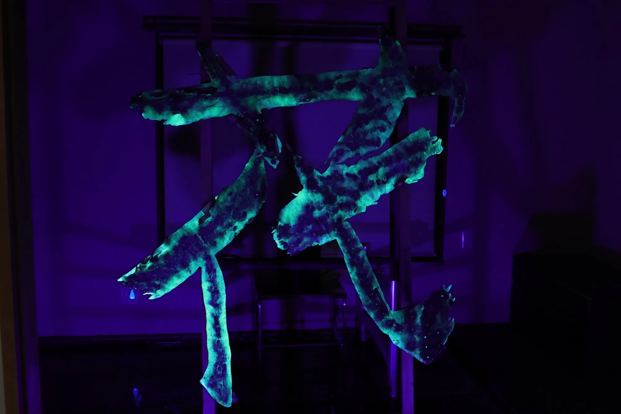 100歳まで生きた自身の祖母を題材とした本作は、低学年頃までしか小学校に通えなかったため、年を重ねてから文字の練習をしたという祖母が、作家の書道道具で書いた「花」の字を花火で刹那に蘇らせるというもの。作品全体に蛍光塗料が塗られており、花火によってついた焦げ目が暗闇に浮かび上がる。建物の住人が生きた痕の残る部屋のなかに、作家個人の記憶という別の時間軸が交差し、どこか異界のような雰囲気に引き込まれる。