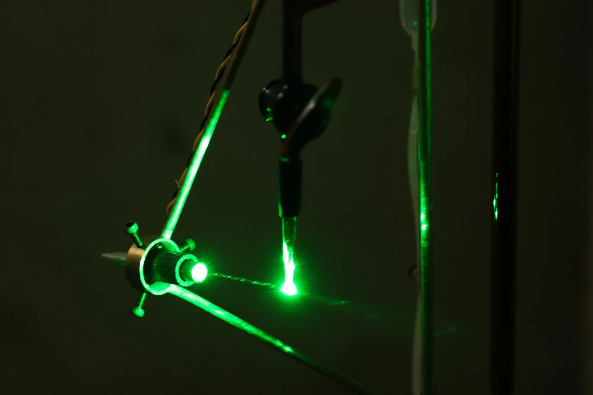 これですべての作品を見終わったかと思いきや、まだ出会っていなかった作品があることに気づく。入場時には見落としていたが、会場入り口の地下にも展示空間があったのだ。1階に戻って荷物を置き、細いハシゴを使って地下へと降りると、ひんやりとした暗い空間をぼんやりと緑の光が照らしている。