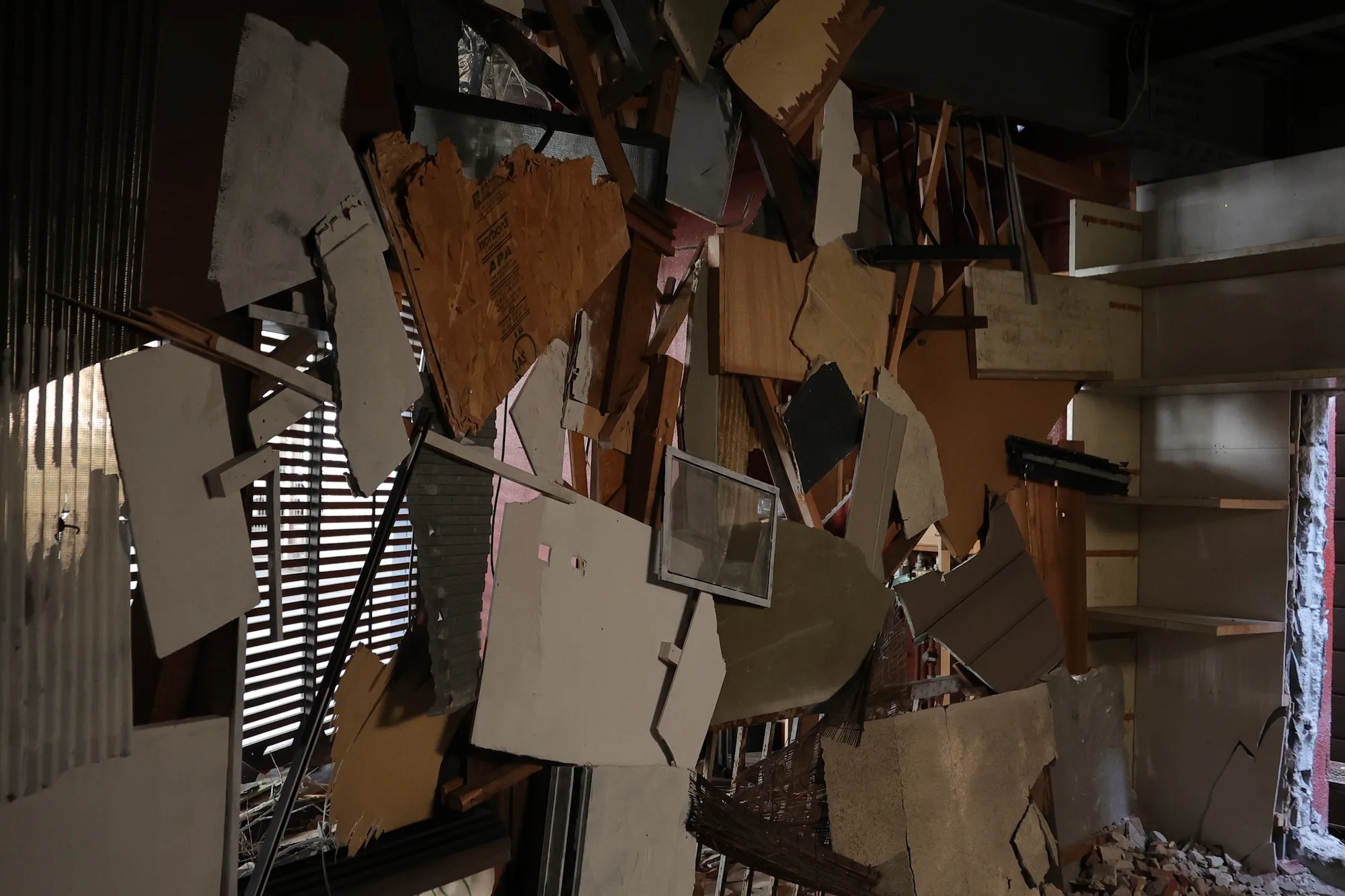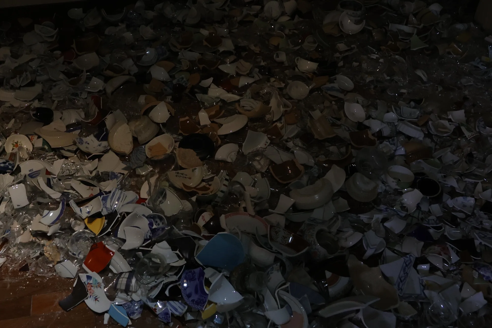 隣の建物に視線を向けると、こちらには「花」の文字の掛け軸が見える。これは黒瀧紀代士の作品で、今回「花」の作品が隣り合ったのは偶然なのだという。渡された足場を使って玄関脇の壁に空いた穴から室内に入ると、割れた食器類が床をぎっしりと埋め尽くしている。こちらも黒瀧の作品で、《虚しく聳え北叟笑む》と題されたインスタレーションだ。この家で使われてきた食器類だろうか。役目を終えた皿やグラスの破片たちが部屋の奥まで敷き詰められている。