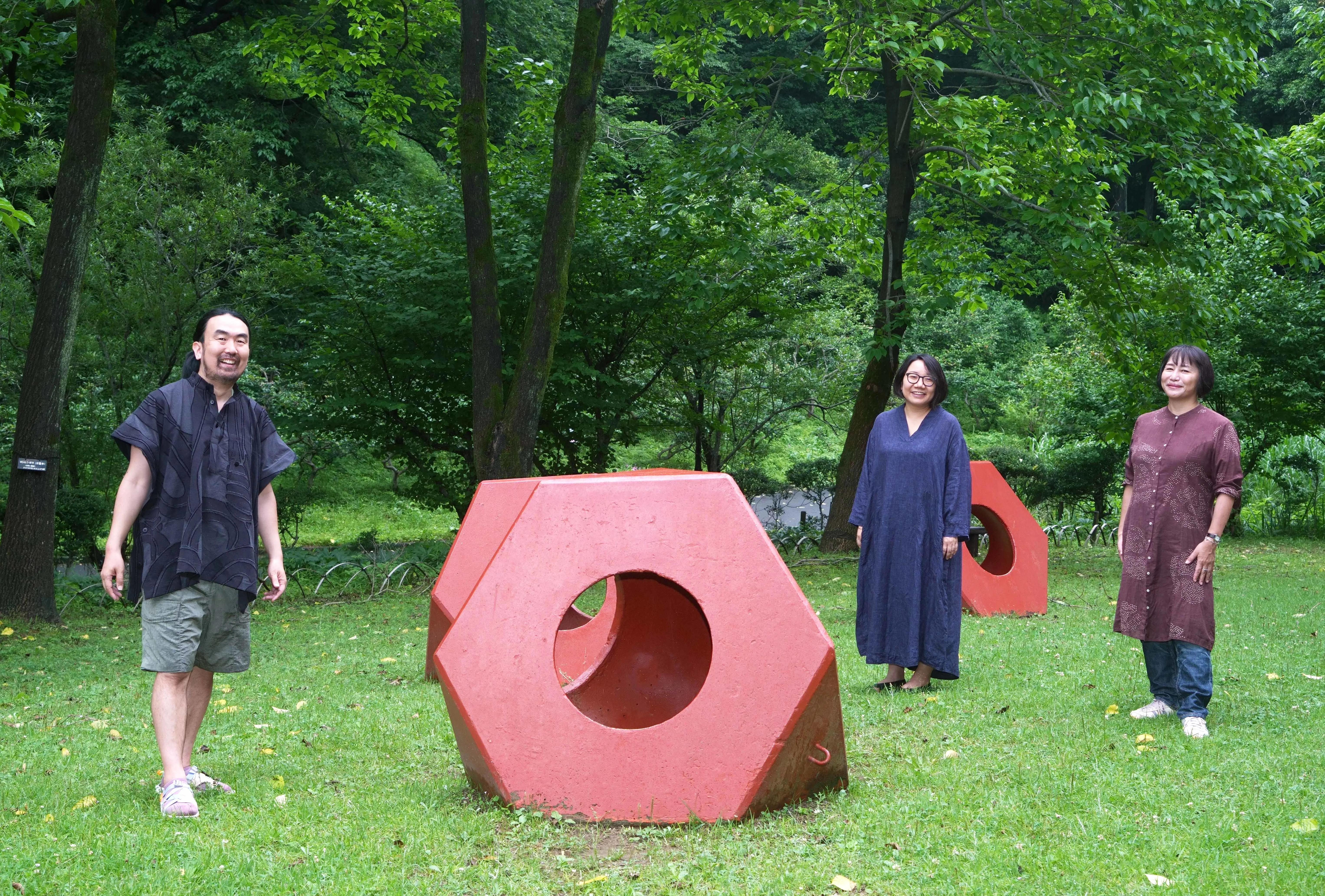 左から、堀川理沙、荒川ナッシュ医、高橋瑞木 イサム・ノグチ《オクテトラ》のあるこどもの国にて 横浜 写真:細川葉子