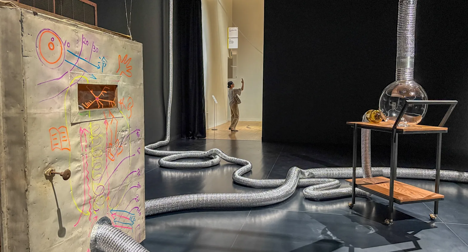 学芸員の岡村は「近年の作品では、コンセプトや作品に込められたメッセージのプレゼンテーションを、インスタレーションに託すような試みがなされている」と指摘。部屋に張り巡らされた工業用のダクト、部屋の隅に配されたファン、部屋に吹く風、回り続けるグラスなど、この空間に散りばめられた諸要素は、それぞれが新たな関係性を生み出す。