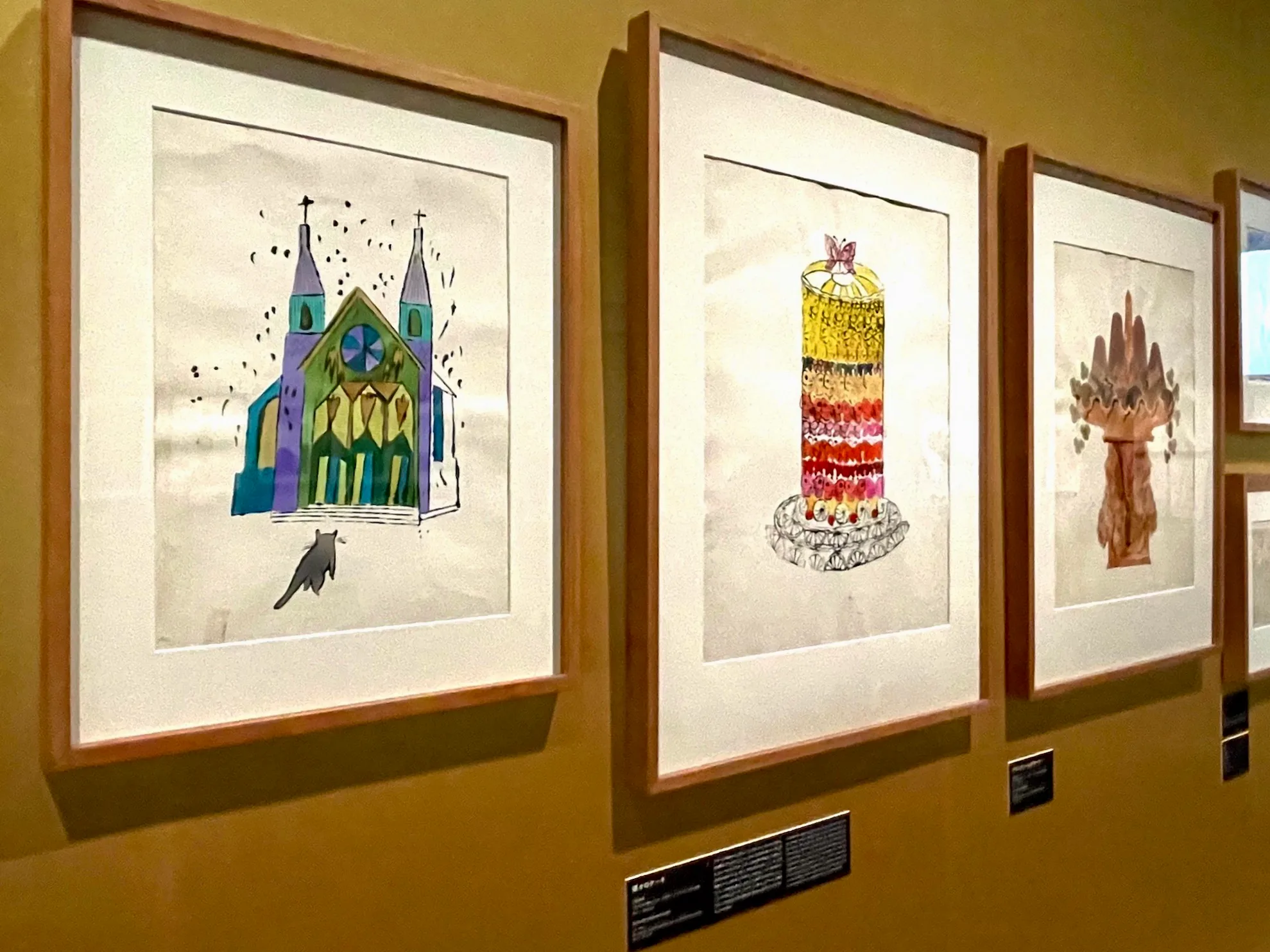 最初に展示されているのは、ウォーホルが有名アーティストとなる以前の、イラストレーターとしてのドローイング作品。その特徴的な技法は、鉛筆で描いた線の上を黒インクでなぞり、乾かないうちに別の紙を押し当てて転写する、ブロッテドラインと呼ばれるにじみ線。このほか、スタンプによるドローイングも試みていて、反復や転写という、後にアート作品に用いるテクニックの萌芽が見える。
