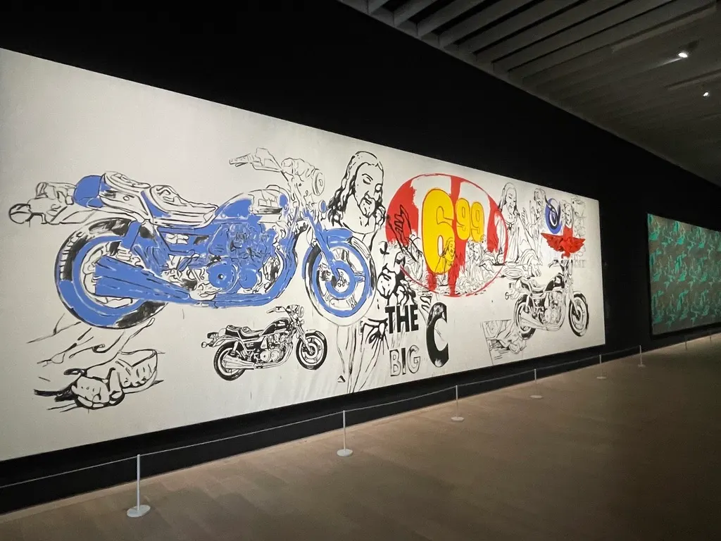 あまり知られていないことだがウォーホルは敬虔なカトリック信者で、幅10m近い大作であるウォーホル版の《最後の晩餐》(1986)は、彼にとって特別な意味を持つ作品だ。中央に描かれた[BIG C]は、「がんcancer治療に効く心構え」という新聞の見出しを流用したものだが、死への恐怖からの救済を与えるキリストのCとも取れる。そして男性聖人の群像にバイクが重なる。