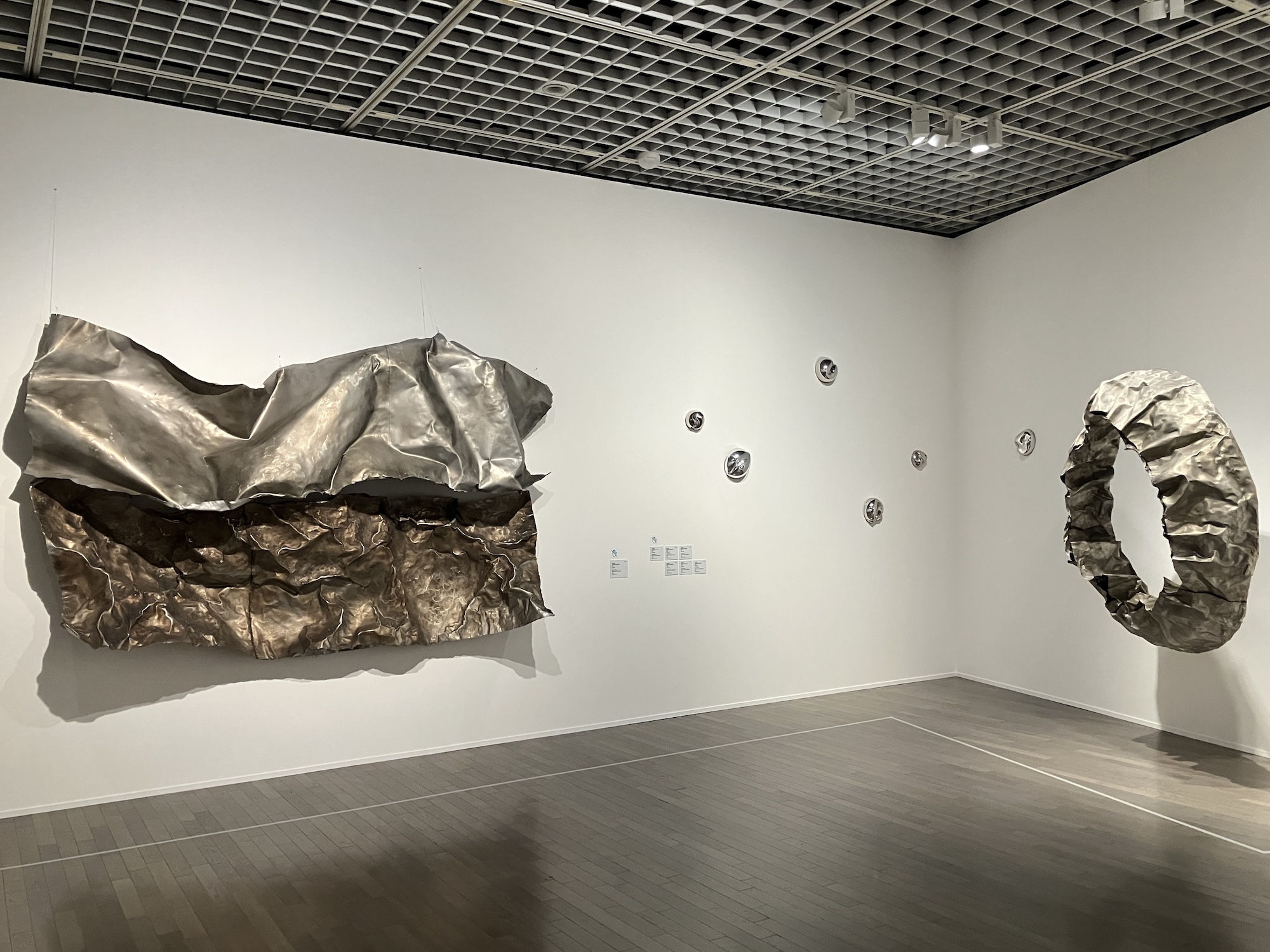 会場風景より、左から田中敦子《Work 1963 B》(1963)、《作品 66-SA Work 66-SA》(1966)、一番右は《地獄門》(1965-69) ©︎ Kanayama Akira and Tanaka Atsuko Association