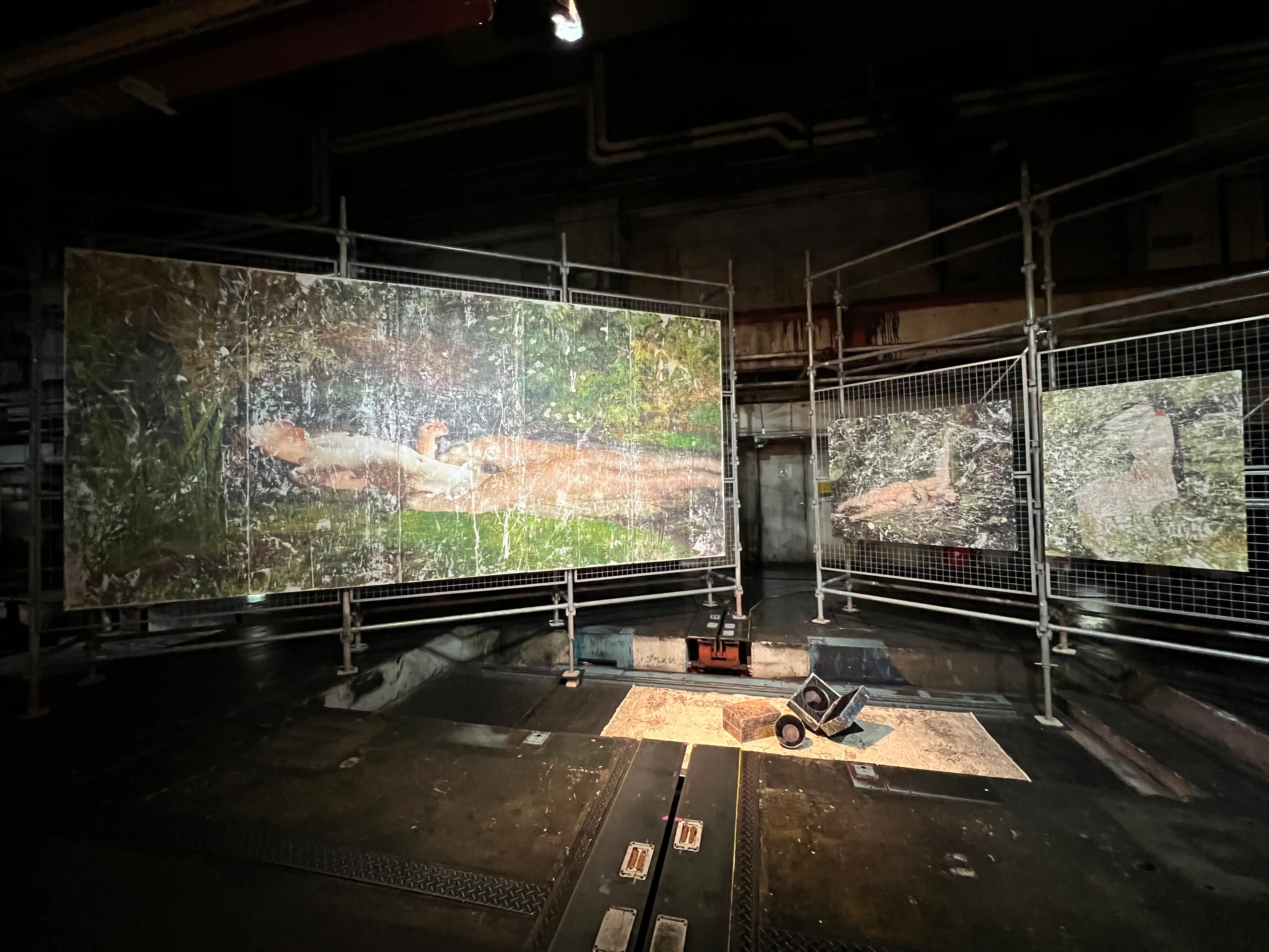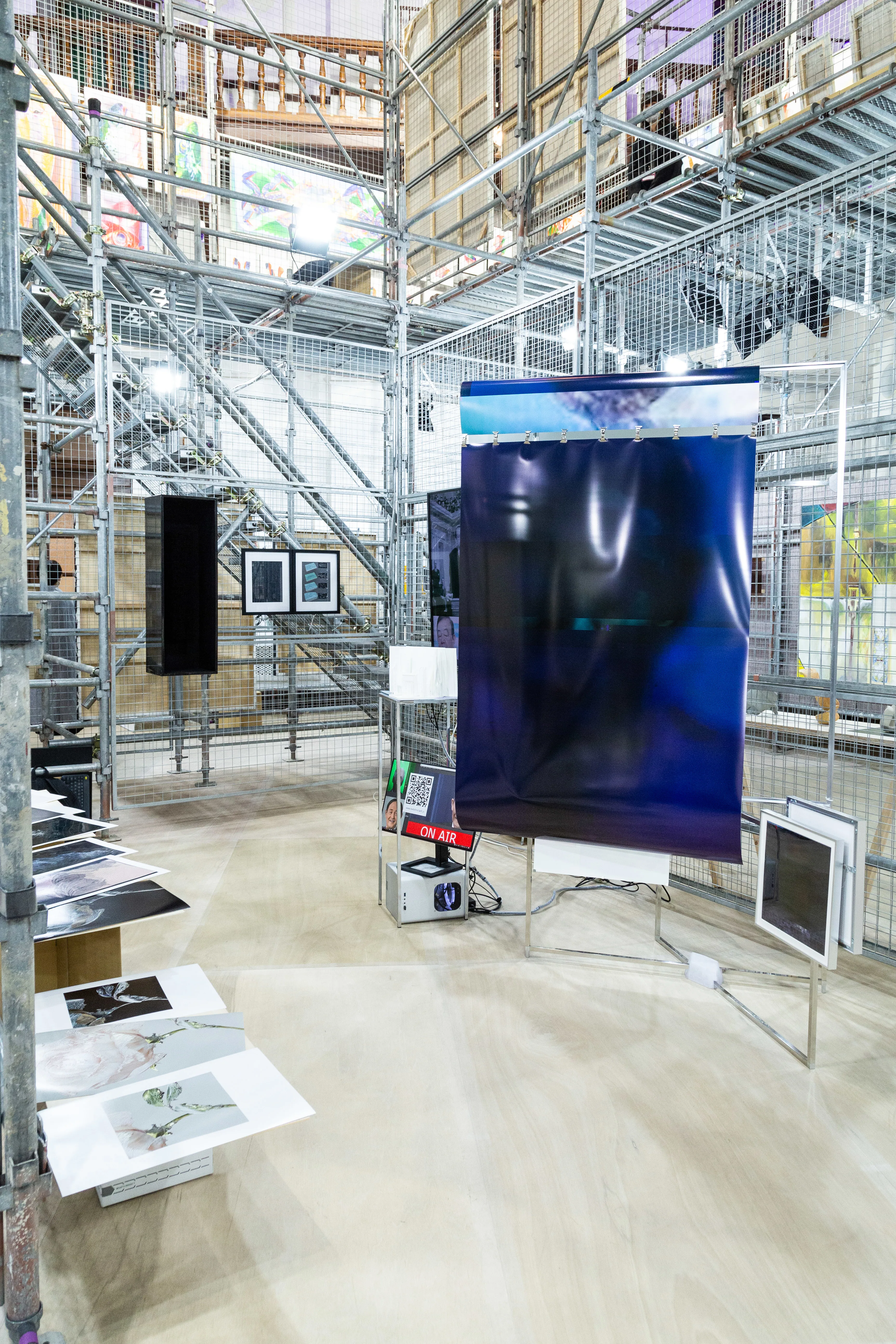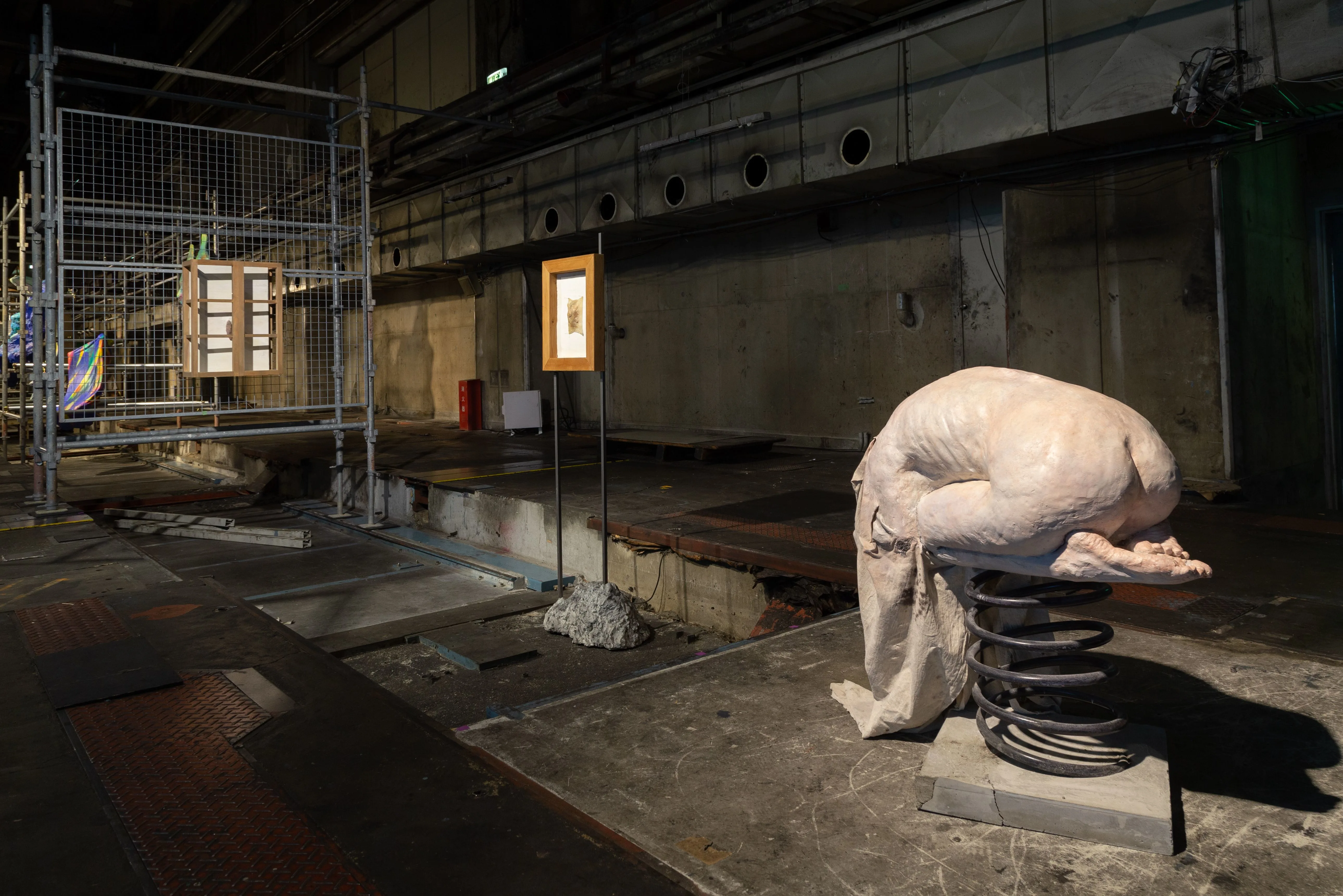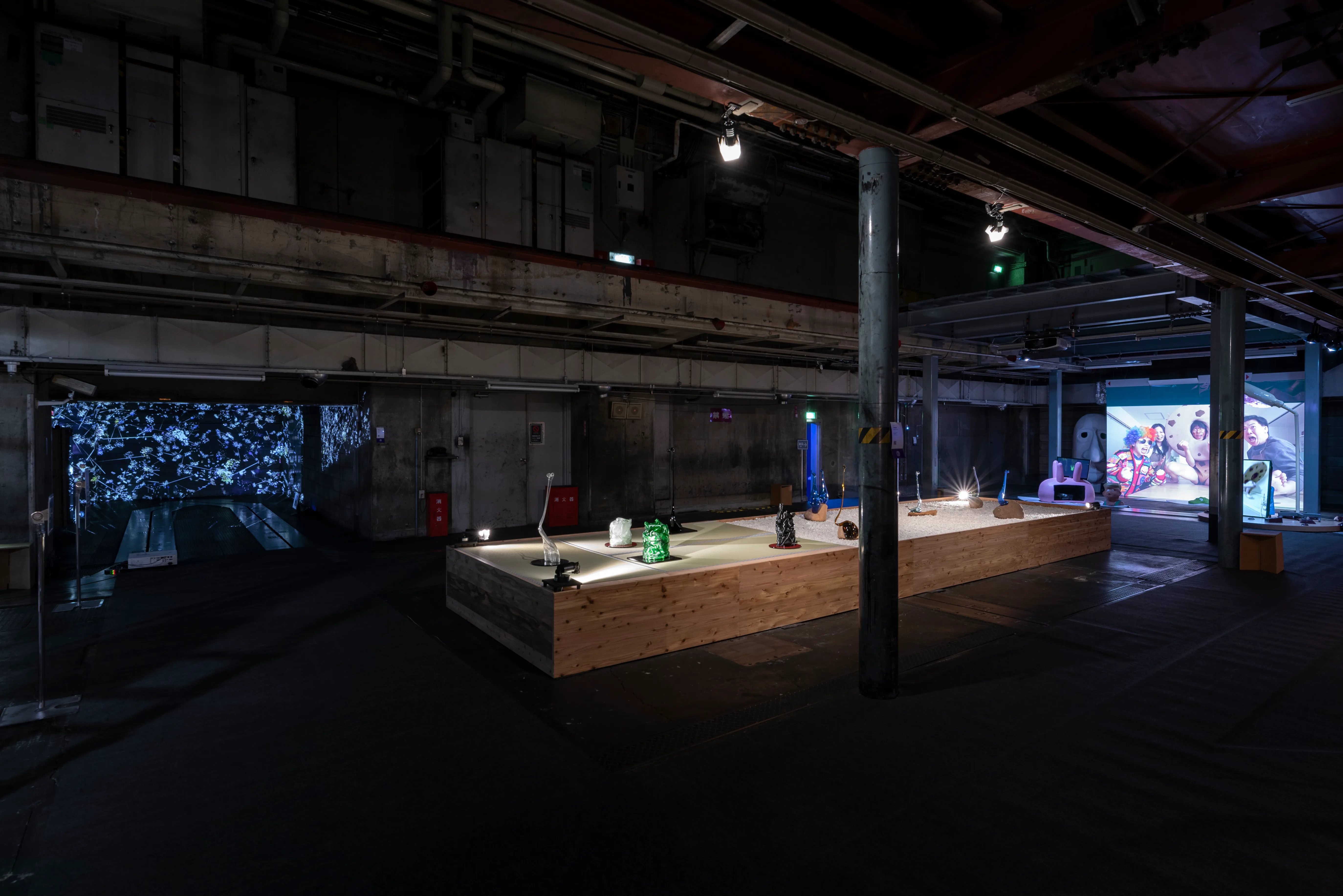 京都新聞ビル地下1階では、大きな立体作品やテクノロジーを駆使したインスタレーション、パフォーマンスの映像など、多様な表現手法の作品を展示する。