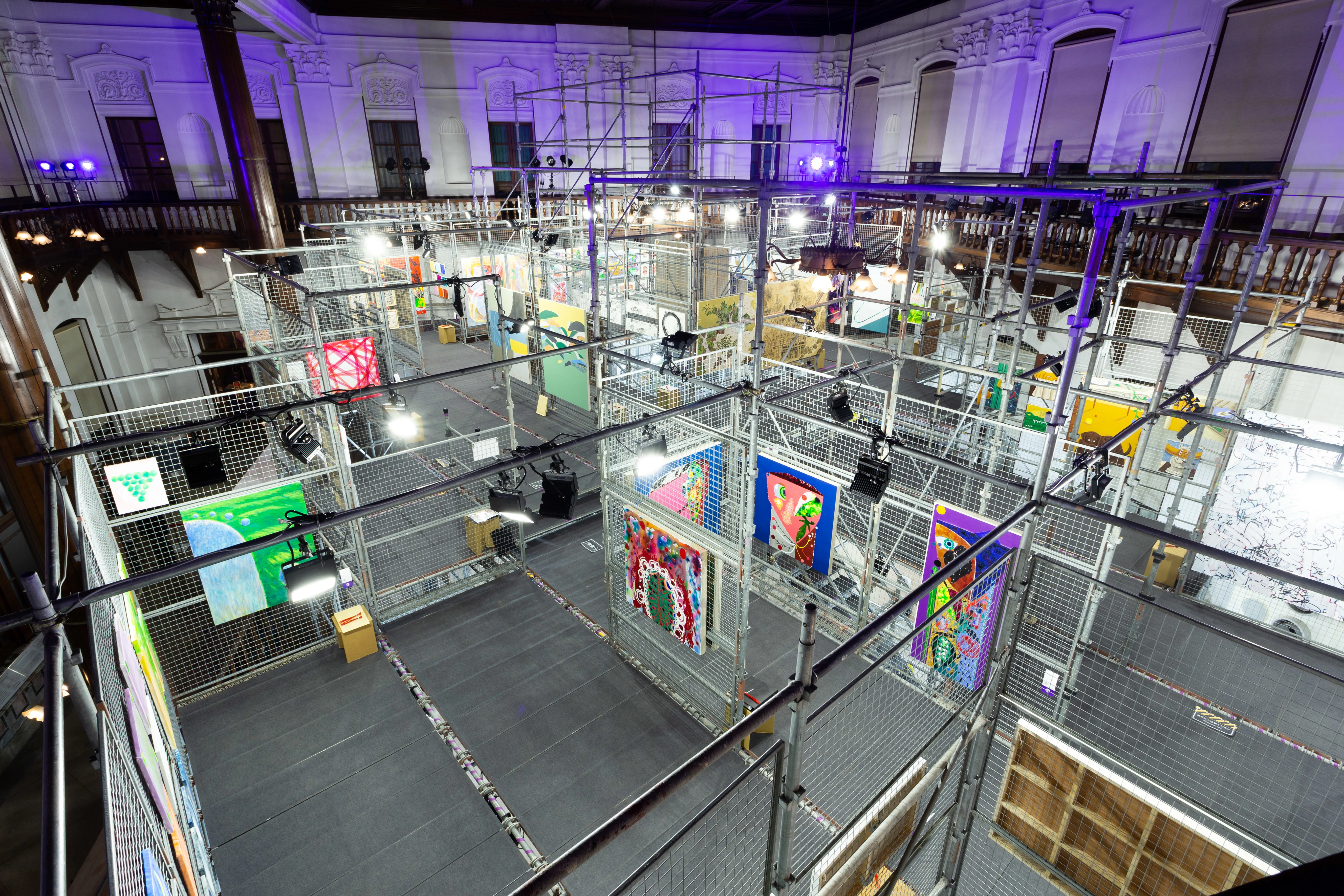 京都府京都文化博物館別館は、辰野金吾とその弟子・長野宇平治が設計した明治39(1906)年竣工の建築で重要文化財。ここを舞台に、dot architects(ドットアーキテクツ)が会場デザインを手がける。単管が配され上下の二層構造になっている会場は、建築の持つ歴史的な趣きと、現代的でインダストリアルな雰囲気が混ざり合い、独特の高揚感が生まれている。