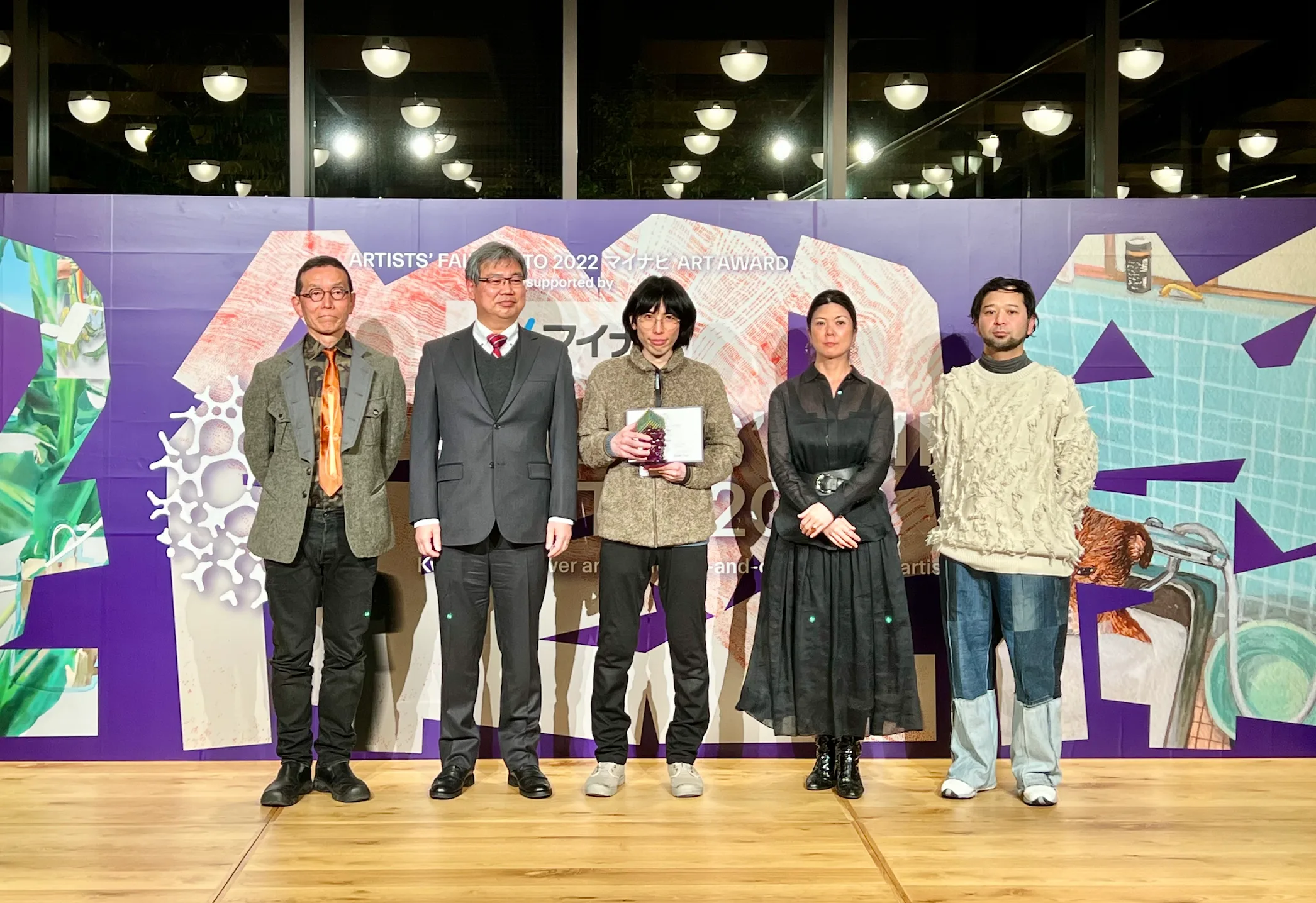 ARTISTS' FAIR KYOTO 2022では、メイン協賛企業の株式会社マイナビ支援のもと、若手アーティストの活動支援をするアートアワード「マイナビ ART AWARD」を実施。今回、最優秀賞を受賞したGoh Uozumiの作品があるのはこの会場だ。Goh Uozumiは故・三上晴子のもとでメディアアートを学び、アート&テクノロジーの領域で活動するアーティスト。授賞式では、これまでの自身の活動について「作っている作品のコンセプトや性質、仕組みが、なかなかマーケットと遠いものになってしまっていた。そうすると(作家として)活動することは難しい。楽な活動履歴ではなかった」と振り返りつつ、今回の受賞については「メディアアートや現代アートといった分け隔てなく、より表現の深いところを見てもらえるようになった」と感謝の意を述べた。最先端の技術を取り込んだ、いわゆる“マーケット向き”とは違う形式の作品にも光が当たることも、本フェアの醍醐味だ。