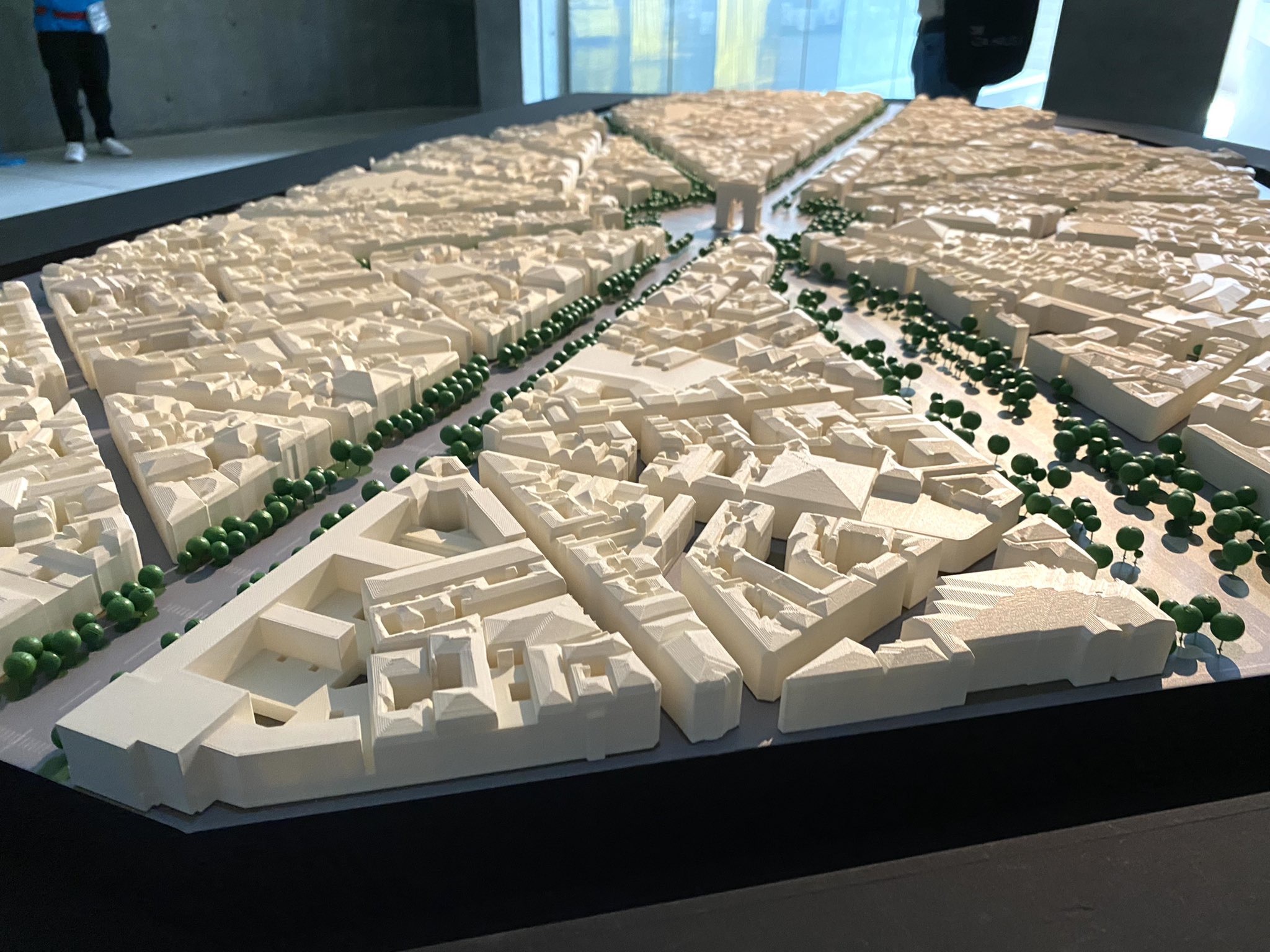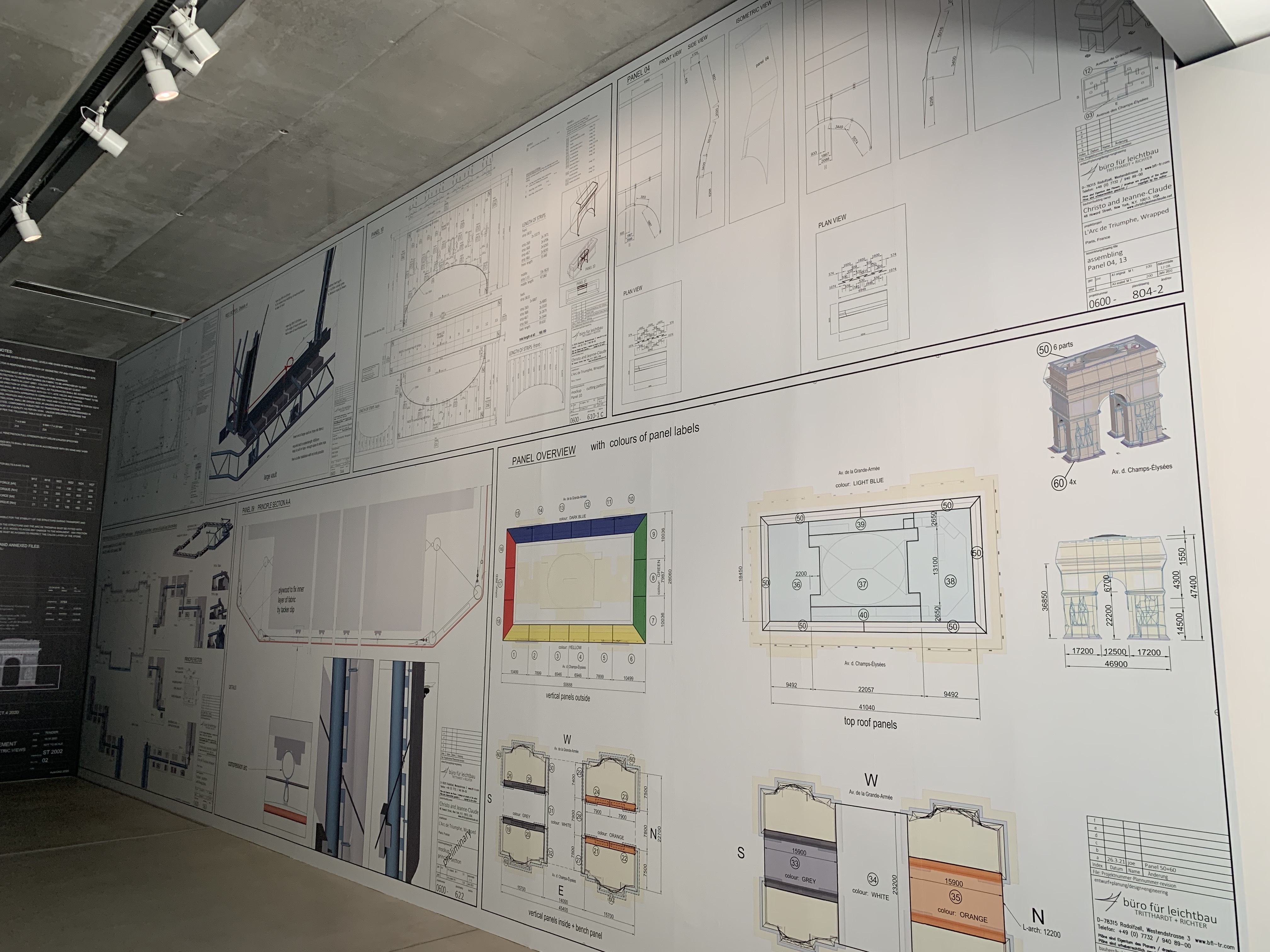 続くギャラリー1の展示空間中央には、施行中の凱旋門の模型が配置。周囲にはパリの地図と精巧なドローイングのレプリカや、準備を行うクリストやスタッフの様子が写真や映像として展示されている。「包まれた凱旋門」は大規模なアートプロジェクトなだけに、アーティストやスタッフが担った具体的な役割が見えづらいかもしれない。しかし、たとえばクリストの多大な仕事ぶりは見事なドローイングを通じて、想像することができるだろう。