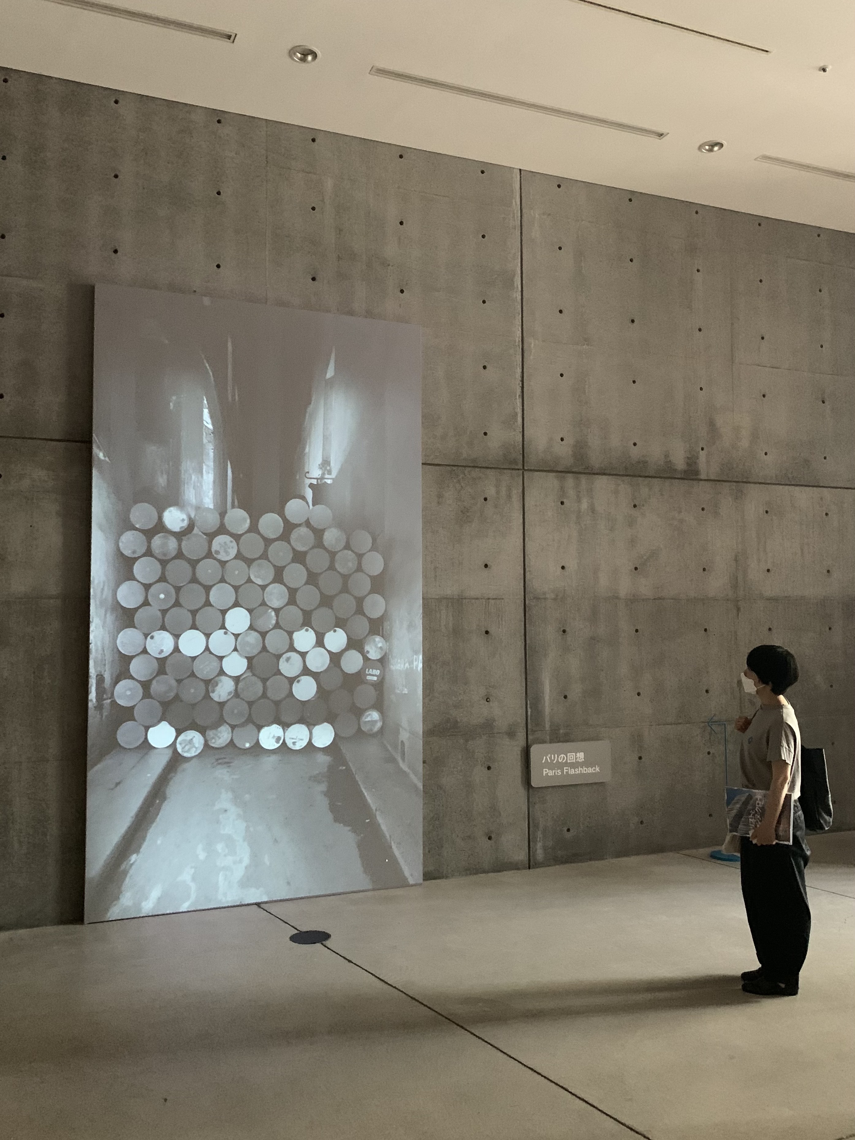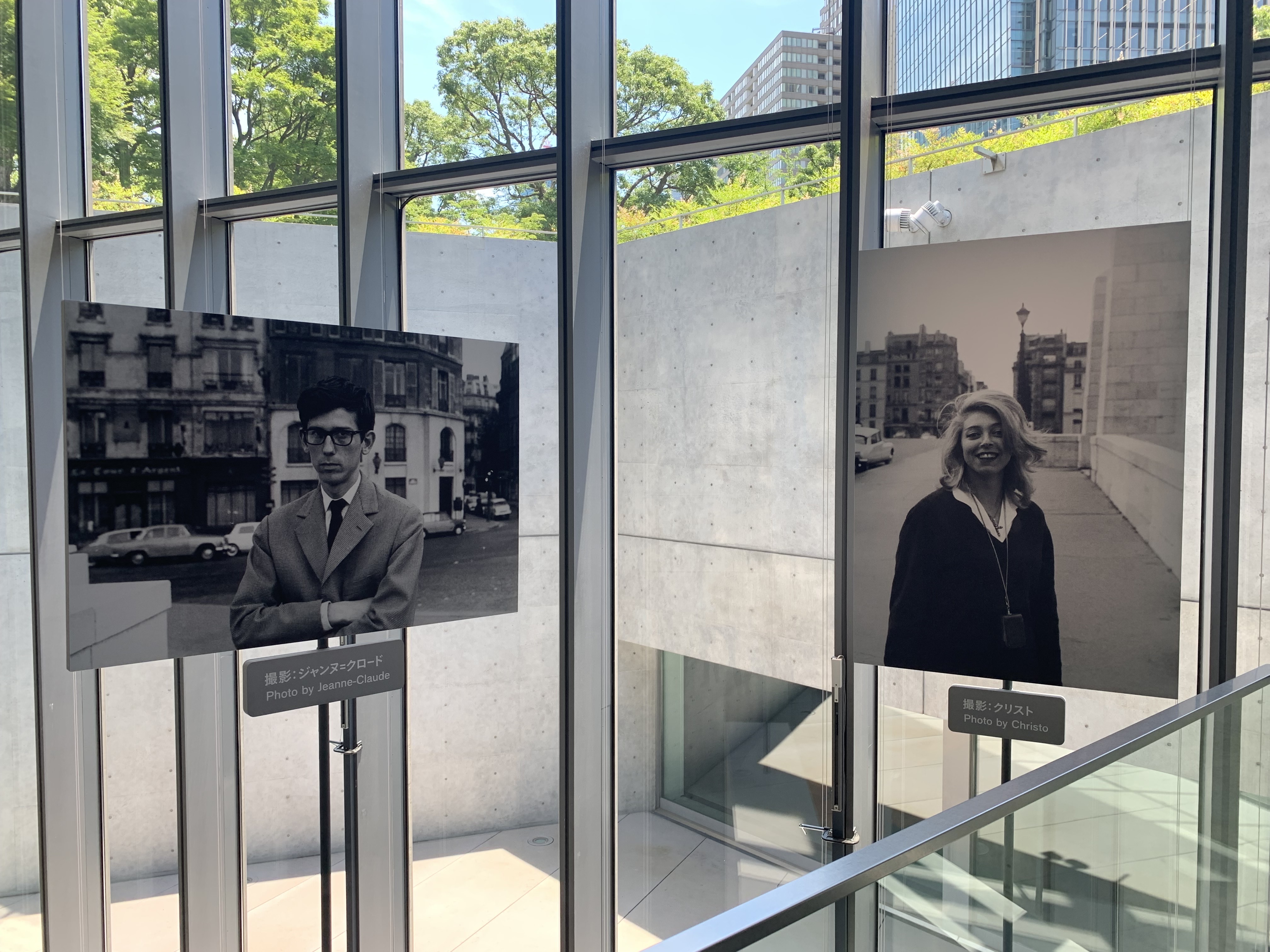 階段を降りた地下ロビーでは、パリを拠点にしていたキャリア初期の活動や、ニューヨークのスタジオでの制作風景、「包まれた凱旋門」のドローイングを描くクリストの様子が紹介される。