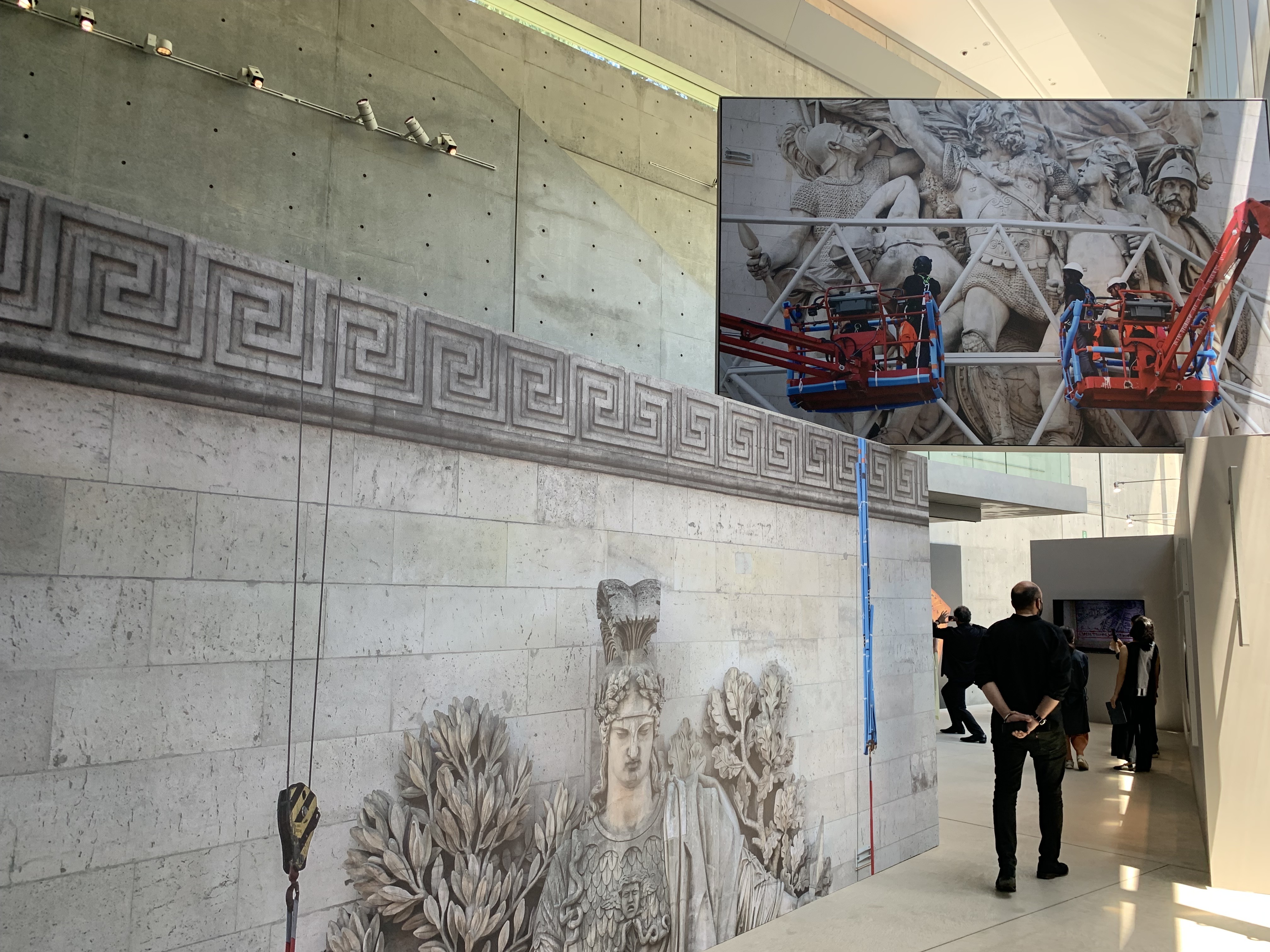 当然のことだが、本プロジェクトはクリストとジャンヌ=クロードの力だけで遂行できたわけではない。ギャラリー2ではナショナルモニュメントである凱旋門を保護しながらロープや布をまとわせるための施工計画や、プロジェクトに尽力した14人へのインタビュー映像や、スタッフの写真を通じて、本プロジェクトの細部にフォーカスし、空間インスタレーションとして「包まれた凱旋門」の再構成を試みている。