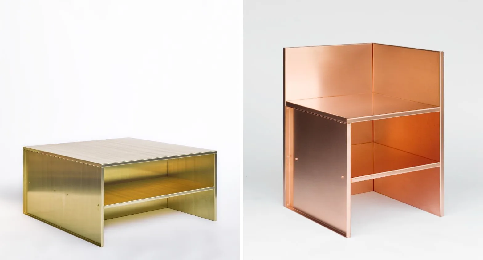左:Metal Table 112 Brass / H50×W100×D100cm 右:Metal Corner Chair 115 Copper / H75×W50×D50cm
