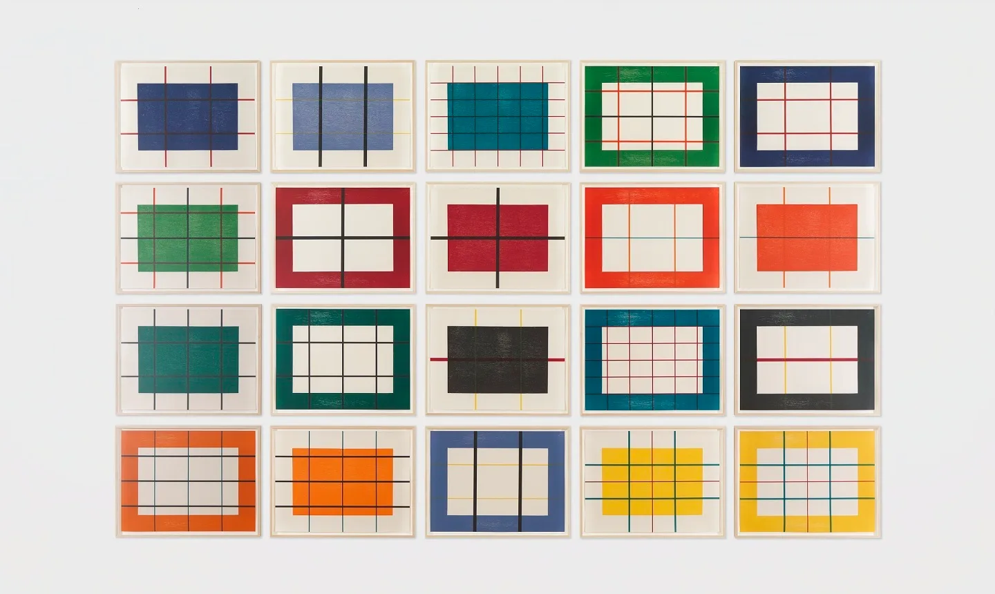 また、家具と合わせて版画作品も展示販売。版画家としてのジャッドは、形の比率や左右の釣り合いを重視し、色の組み合わせや変化を考えるための方法を版画制作に取り入れてきたという。本展では、40年以上にわたり版画制作に取り組んだジャッドの完全な版画セット4作品が並ぶ。ジャッドの初期の版画では一色または二色が使われることが多く、後期には木版による多色刷りが用いられた。最大のセットは、20点組の木版で構成されている。