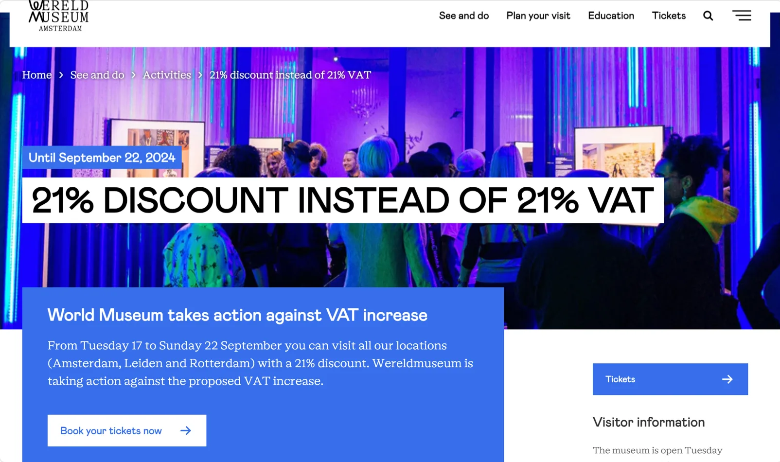 国立世界博物館(Wereldmuseum)は発表の前日にあたる16日に、抗議活動の一環として17日のプリンシェスダーグから22日までの5日間、アムステルダム、ライデン、ロッテルダムの全館で21%割引を適用した。発表には博物館協会(MuseumVereniging)がValidators社と共同でオランダ国民を対象に実施した、ミュージアムの社会的影響に関する調査のデータ引用し、以下のように述べられている。