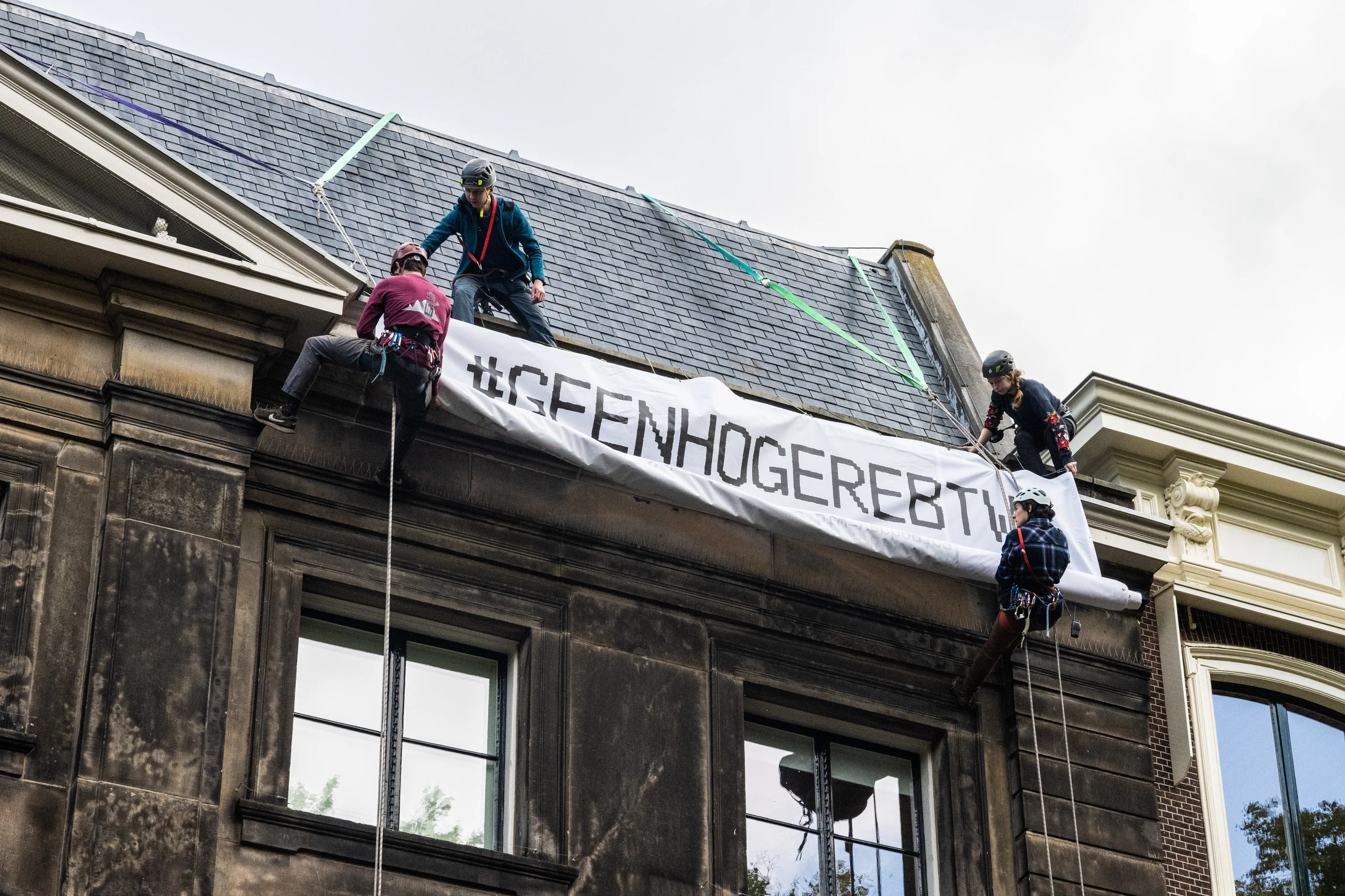 これに関して、オランダの国会議事堂が立地するデン・ハーグに所在するエッシャー美術館やHuis van het boek(本の美術館)では、17日朝に長さ20mの横断幕「社会への領収書」が掲げられた。