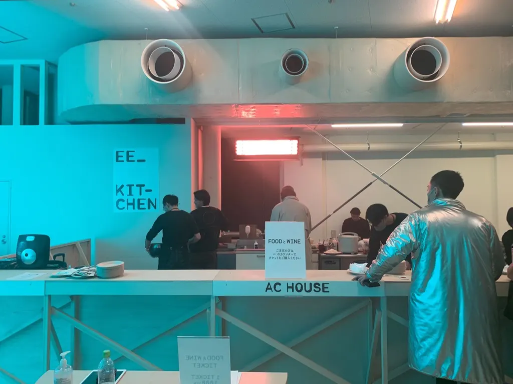 会場左奥では「EE_kitchen」も。「AC HOUSE」や「TYON」、「マグパイカフェ」による料理やドリンク、お菓子が楽しめる。スペース内には、ANOMALYのブースにも出展している玉山拓郎による、ネオンライトを用いた作品も展示される。