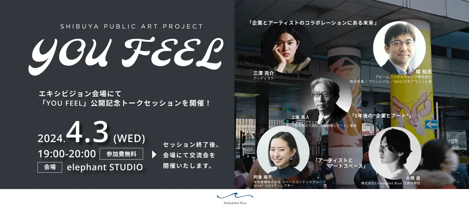 4月3日には、EXHIBITION「YOU FEEL」公開記念トークも開催。『企業戦略としてのアート』著者の上坂真人、寺田倉庫 WHAT CAFEディレクター阿食裕子などを登壇者に、社会とアートの繋がりや、アートと企業の関わりについてトークセッションを開催する。