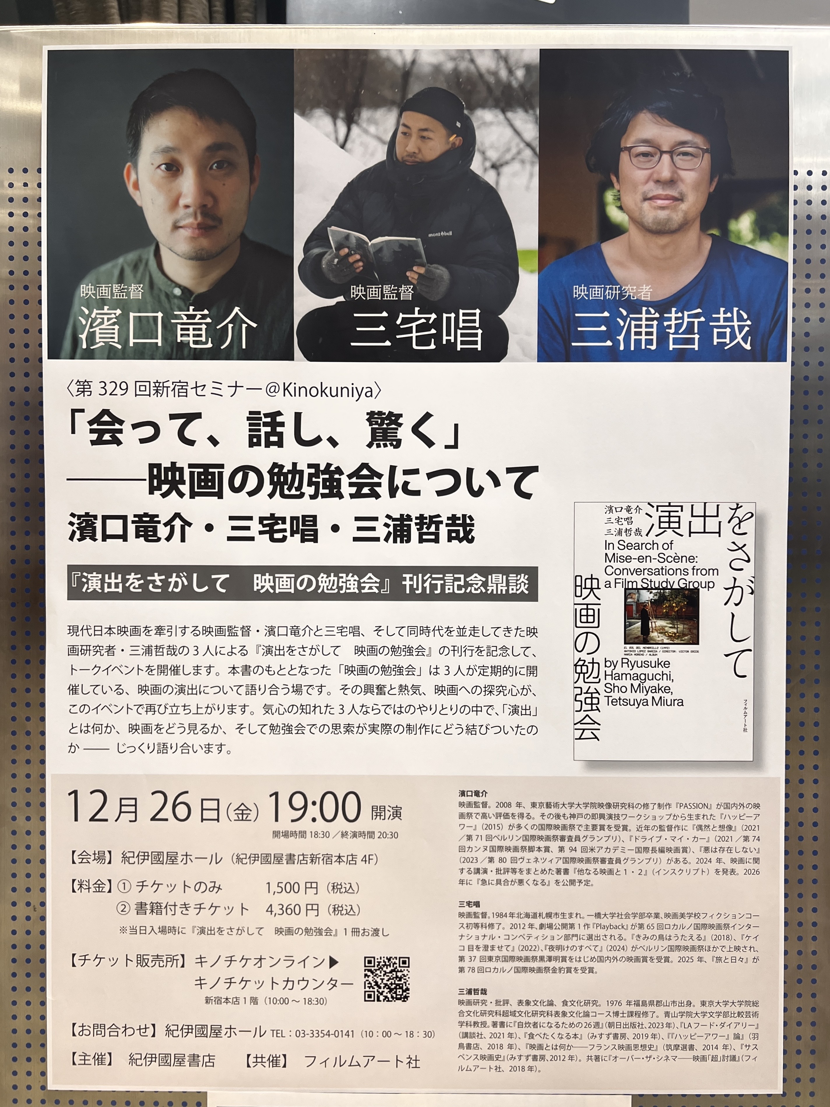 濱口竜介・三宅唱・三浦哲哉 『演出をさがして 映画の勉強会』刊行記念イベント 2025年12月26日、紀伊國屋書店紀伊國屋ホール(新宿本店内)にて開催