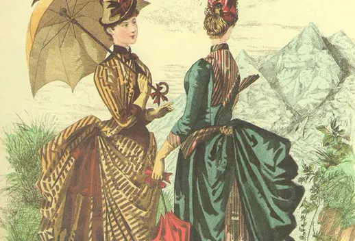 ドレスが貴族階級に限らず市民層にまで広まりはじめるのは19世紀中ごろのこと。ミシンの普及で大量生産が可能になったことや、それまでになかったデパートが誕生したことによって商品の概念ががらりと変わる。19世紀末から20世紀初頭にかけては今のパリ・コレクションの基礎となるオート・クチュールが登場。社会の近代化や、スポーツの流行に伴ってドレスには機能性が求められるようになり、動きやすいデザインへと変わっていく。