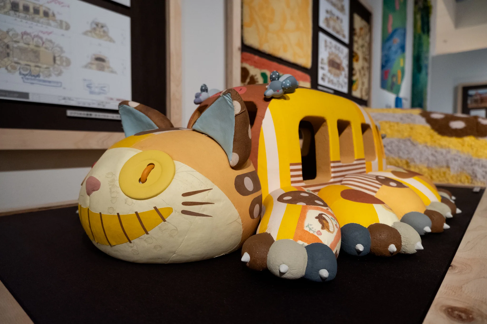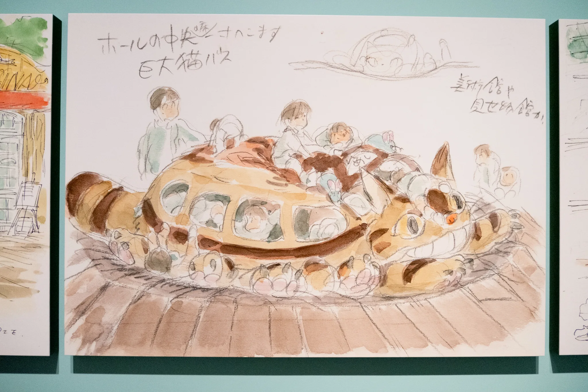 入口をくぐるとまず目を引くのが、『となりのトトロ』でおなじみの大きな「ネコバス」。子供も大人も自由に乗り込むことができ、訪れた人は瞬く間にジブリの世界へと引き込まれる。序盤から、目で見て手で触れ、五感を使った体験ができる仕掛け。「今回の展示は僕がやってきた仕事がわりと中心になっているので、少し恥ずかしいようなところもあるんですけど」と前置きしたうえで、宮崎は開催にあたっての思いを述べた。