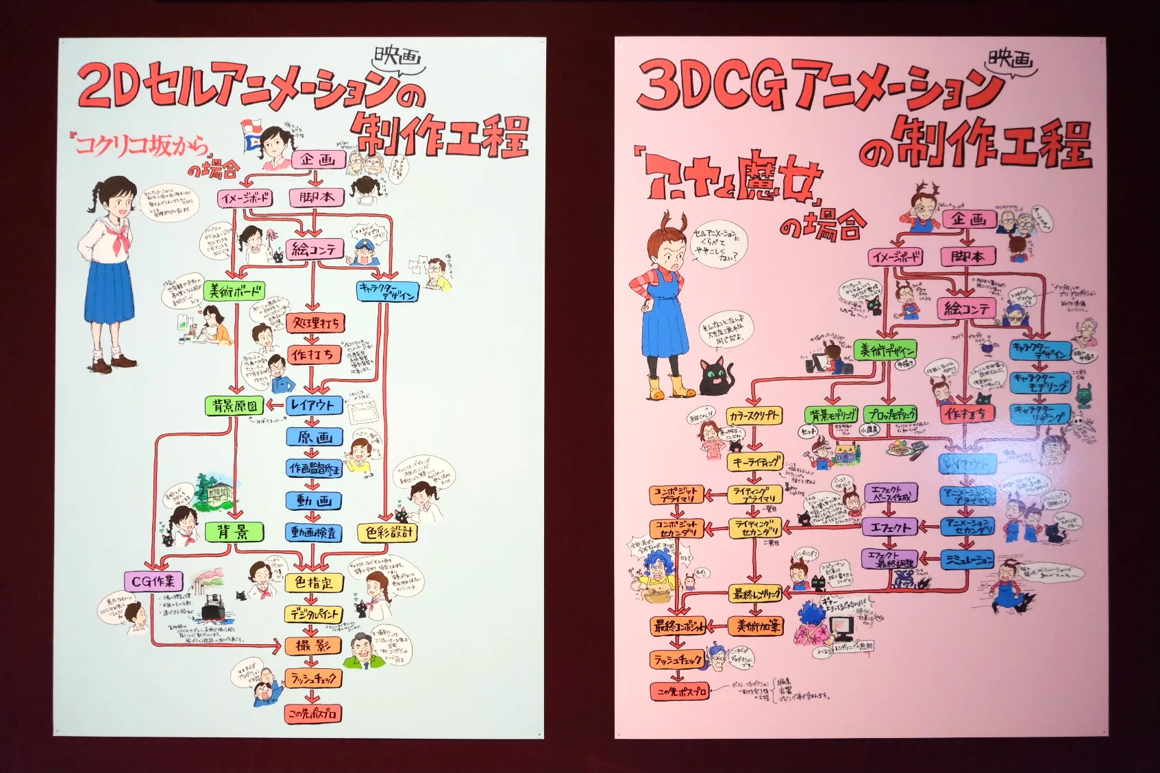 第1章「はじまりは三鷹の森ジブリ美術館」、第2章「アニメーションの世界をつくる」、第3章「アニメーションの世界を本物に」、第4章「ジブリパークのつくりかた」の4つの章で構成。第2章では、2021年6月〜2022年5月まで三鷹の森ジブリ美術館で開催された企画展示「アーヤと魔女展」も再現されており、見応えたっぷりの内容となっている。