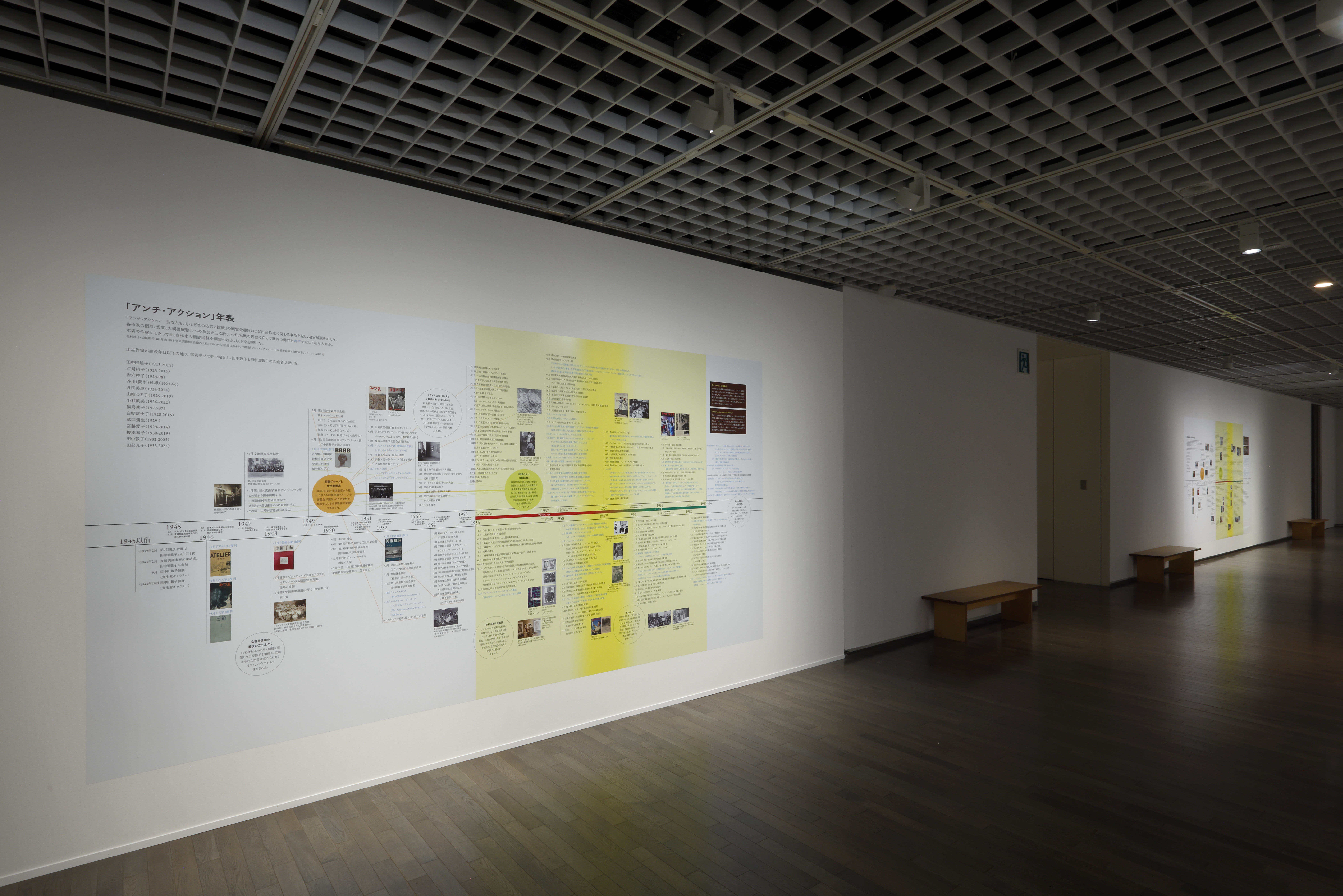 今回、展覧会場に中嶋泉と岡田裕子が訪れ、対談が実現。岡田は昨年「神戸六甲ミーツ・アート2025 beyond」で発表した新作インスタレーション《井戸端で、その女たちは》(2025)で、関西で活躍した日本の女性の物故アーティスト9人を取り上げ、彼女たちが自らの作品や作家としてのあり方を“おしゃべり”する空間を作り上げた。そのうち、戦後に「具体美術協会」で活動した白髪富士子、山崎つる子のふたりは、「アンチ・アクション」展の出品作家でもある。