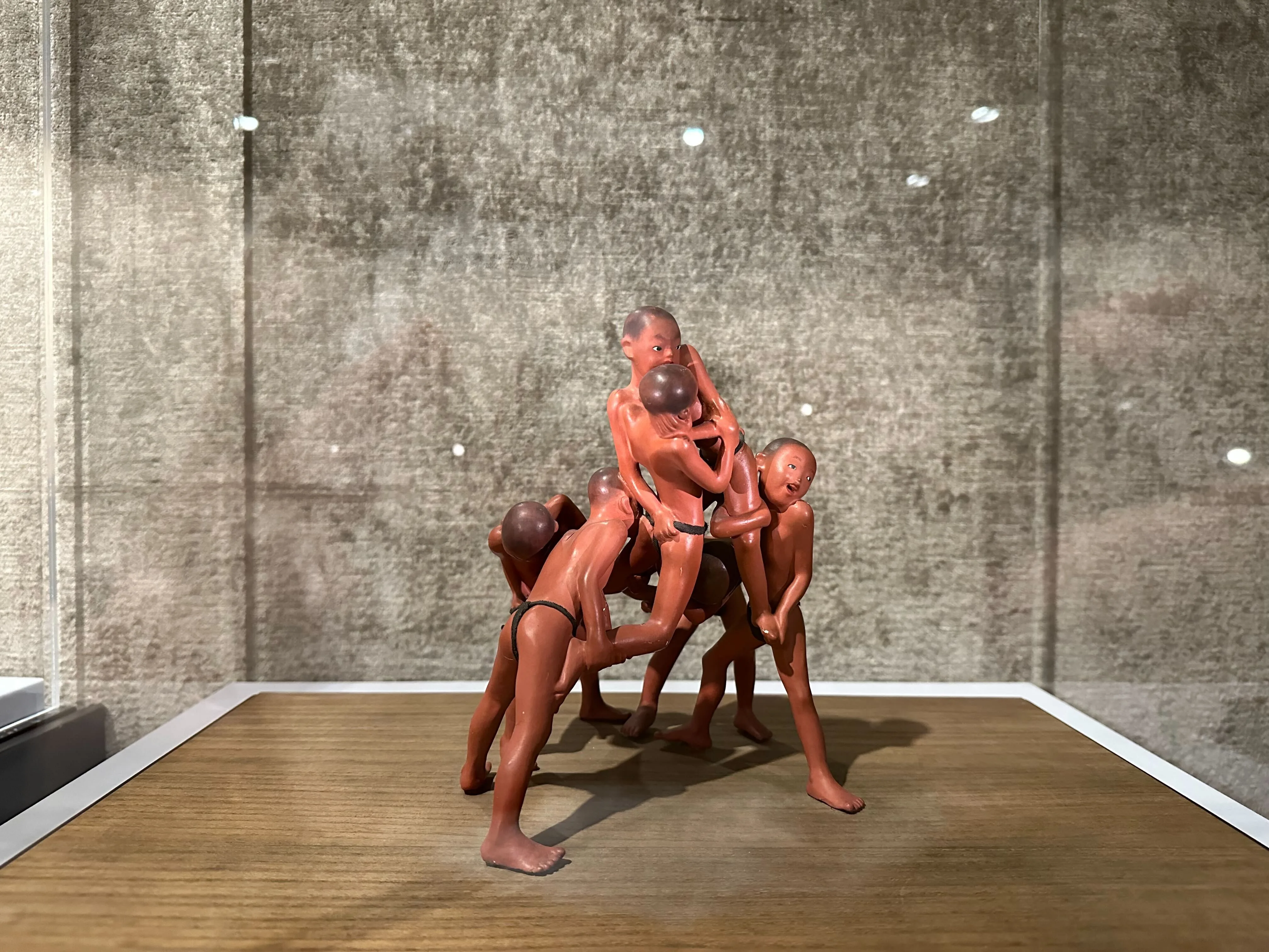 昭和初期になると人形を美術のひとつとして認識する「人形芸術運動」が盛んに。またそれと並走するかのように軍国主義化していく日本の社会状況が人形制作にも反映されていく。高浜かの子《騎馬戦》(1940)や、出兵した青年たちに最後まで寄り添った慰問のために作られた人形は、時代に翻弄された戦時下の人々が人形に何を求めていたのかを考えさせるだろう。