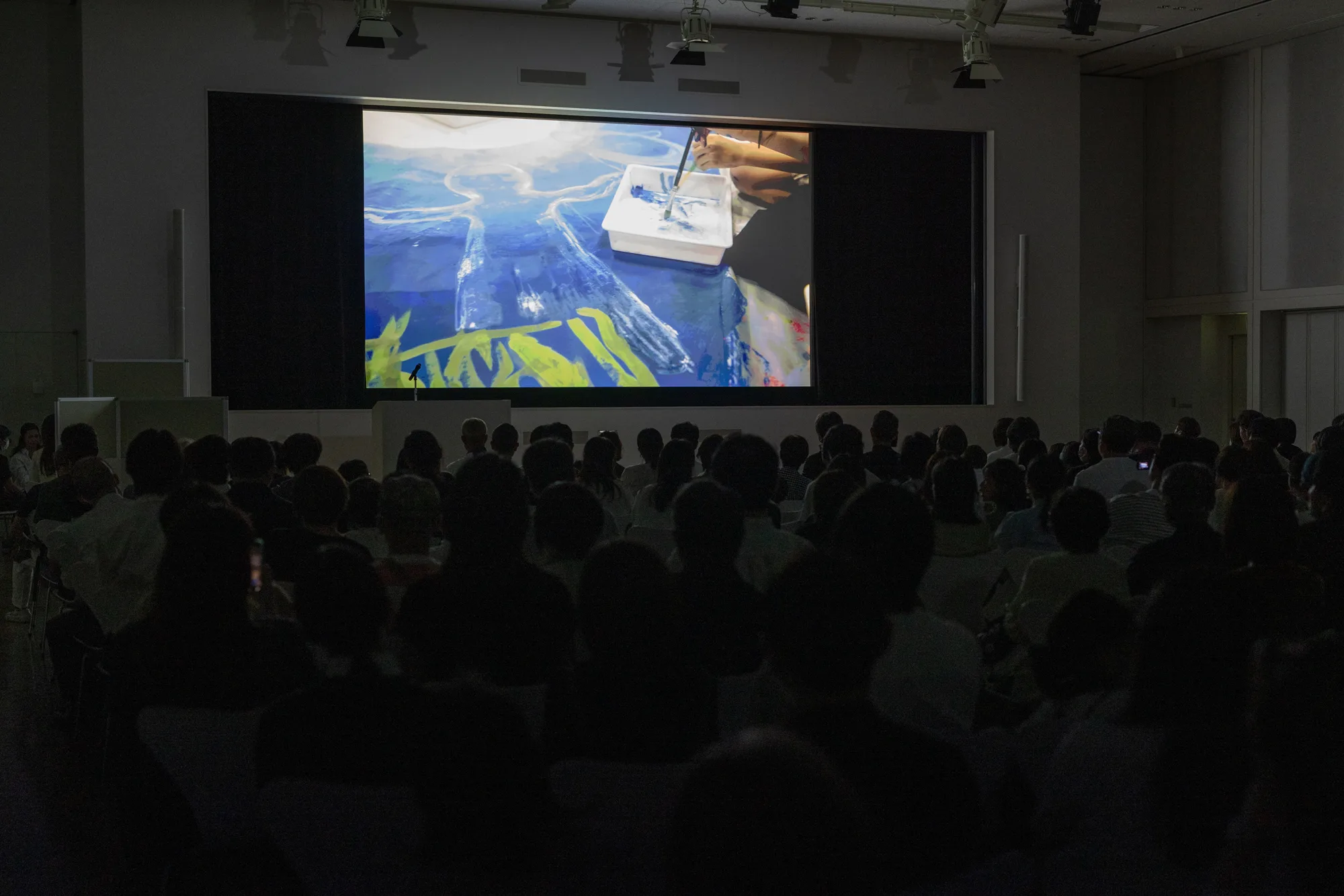 当日会場ではふたつの映像作品が特別上映された。ドキュメンタリー《他者を想像する四日間》は、学展出展者の小中学生7名と髙橋が4日間にわたり行ったワークショップの記録。身体表現や対話、共同制作を通じて巨大キャンバス2枚を完成させる過程を追ったもので、映画監督の二宮健が監督を務めた。子供たちの瑞々しい表情や創造の瞬間が丁寧に映し出され、上映後には会場から温かい拍手が送られた。