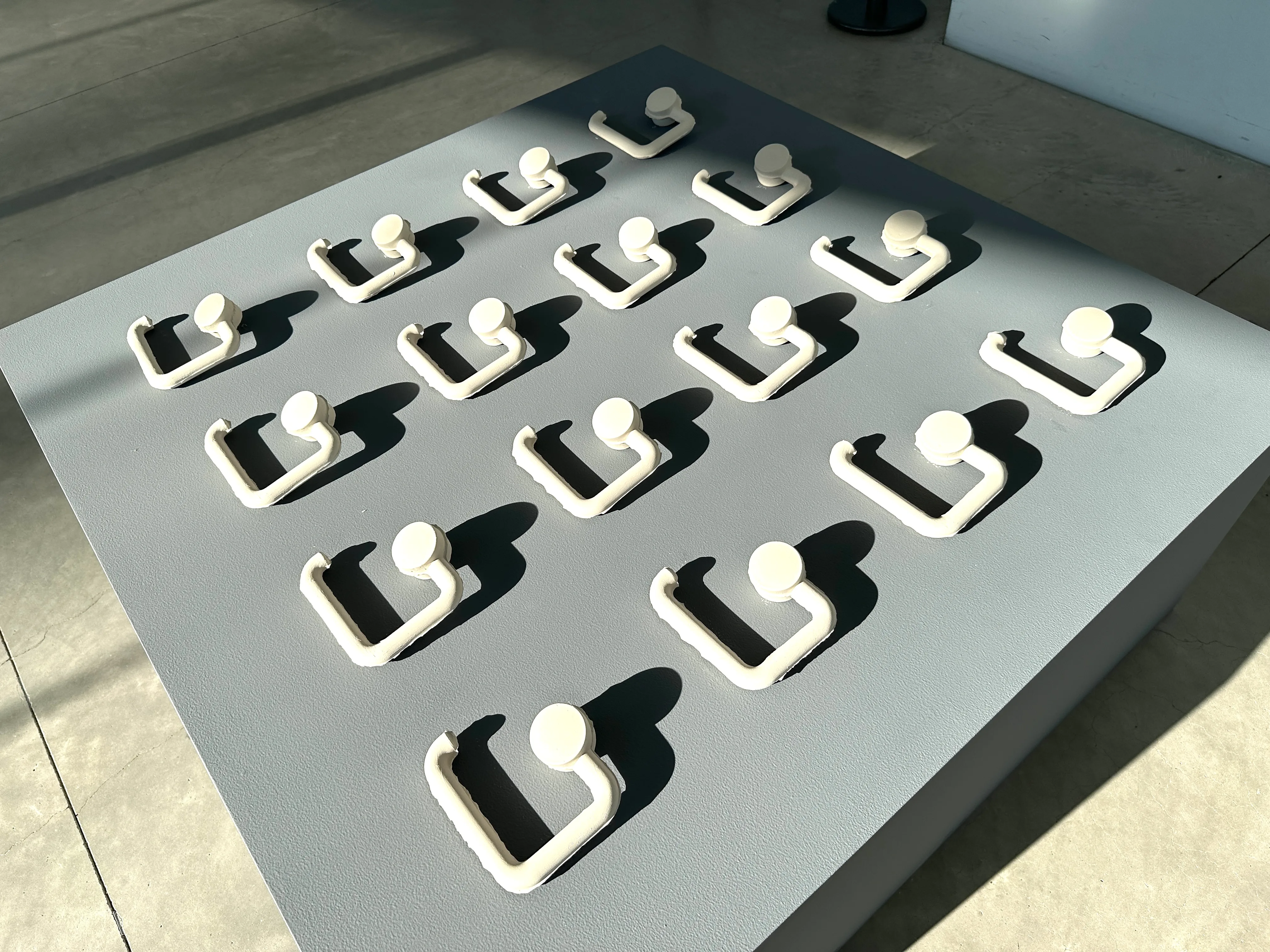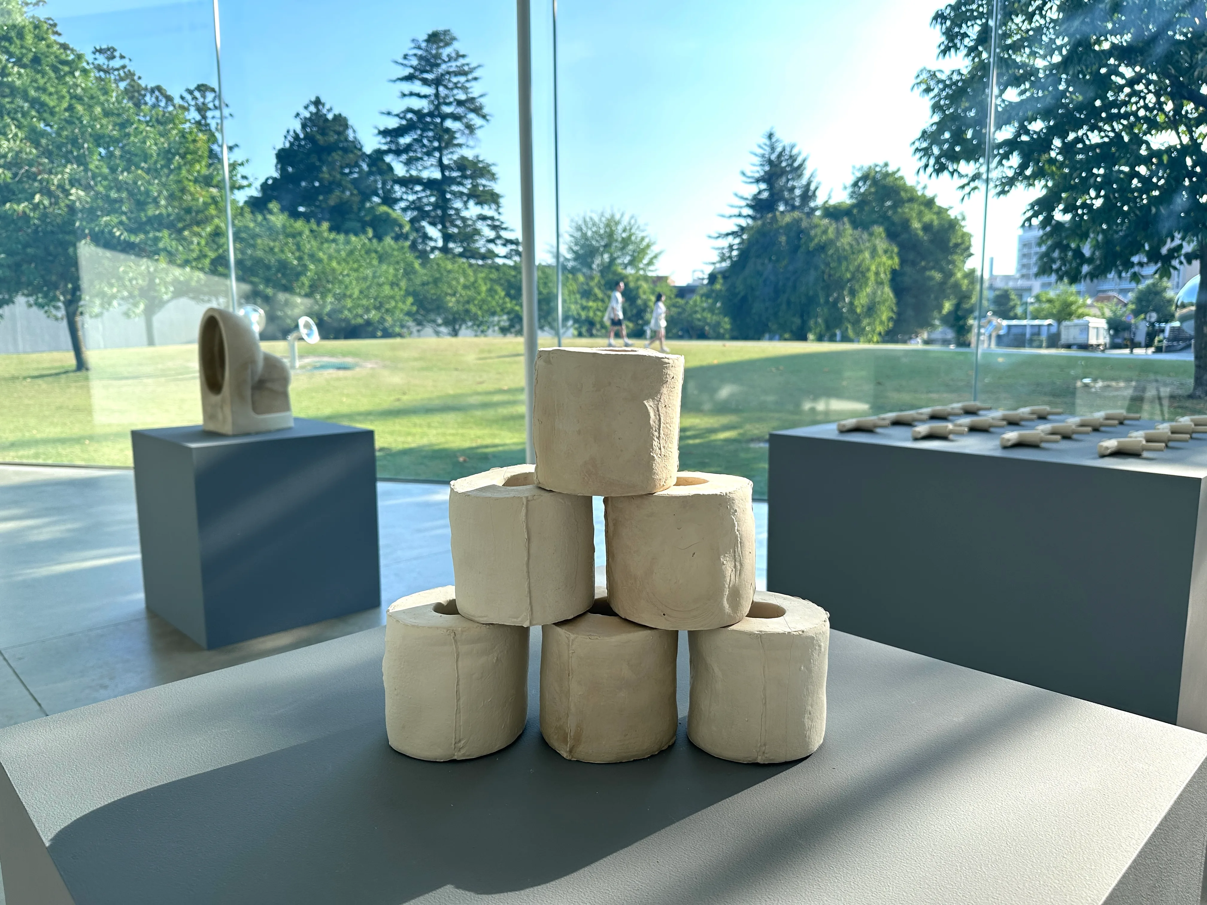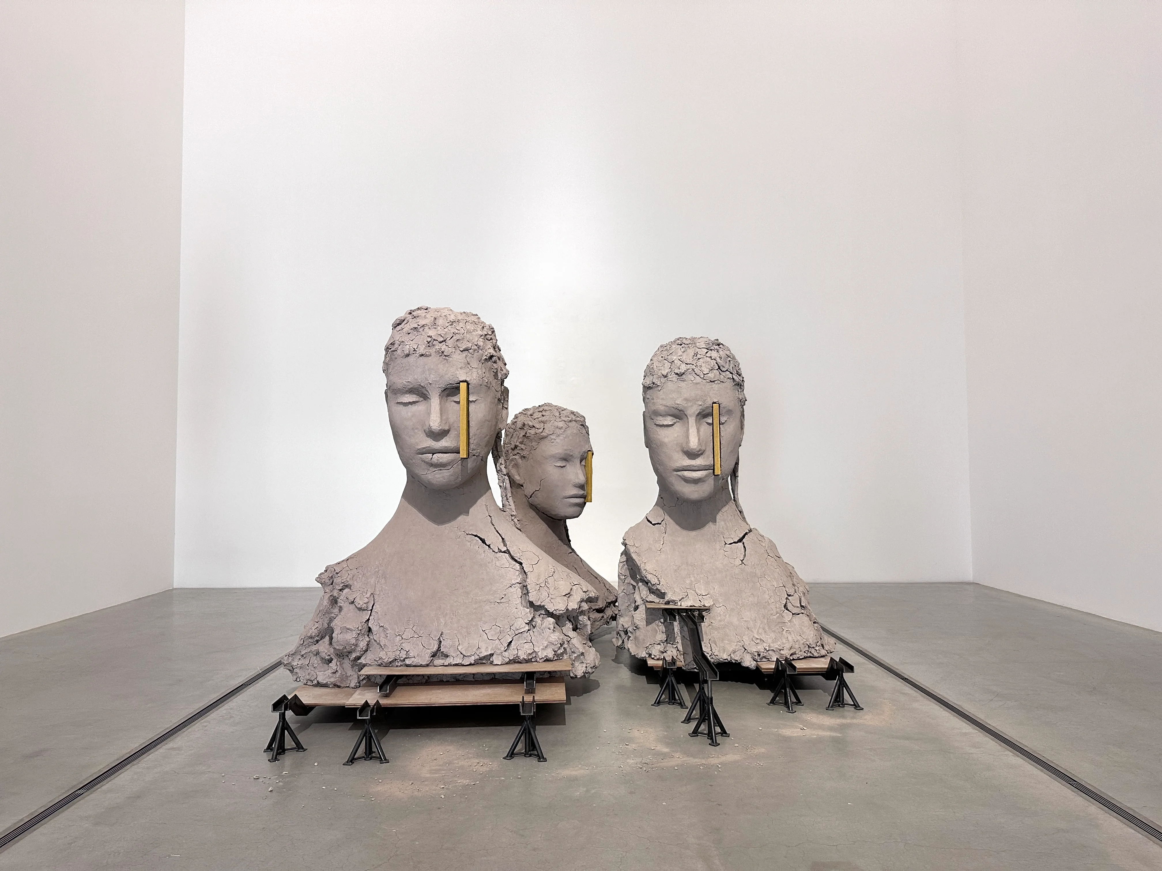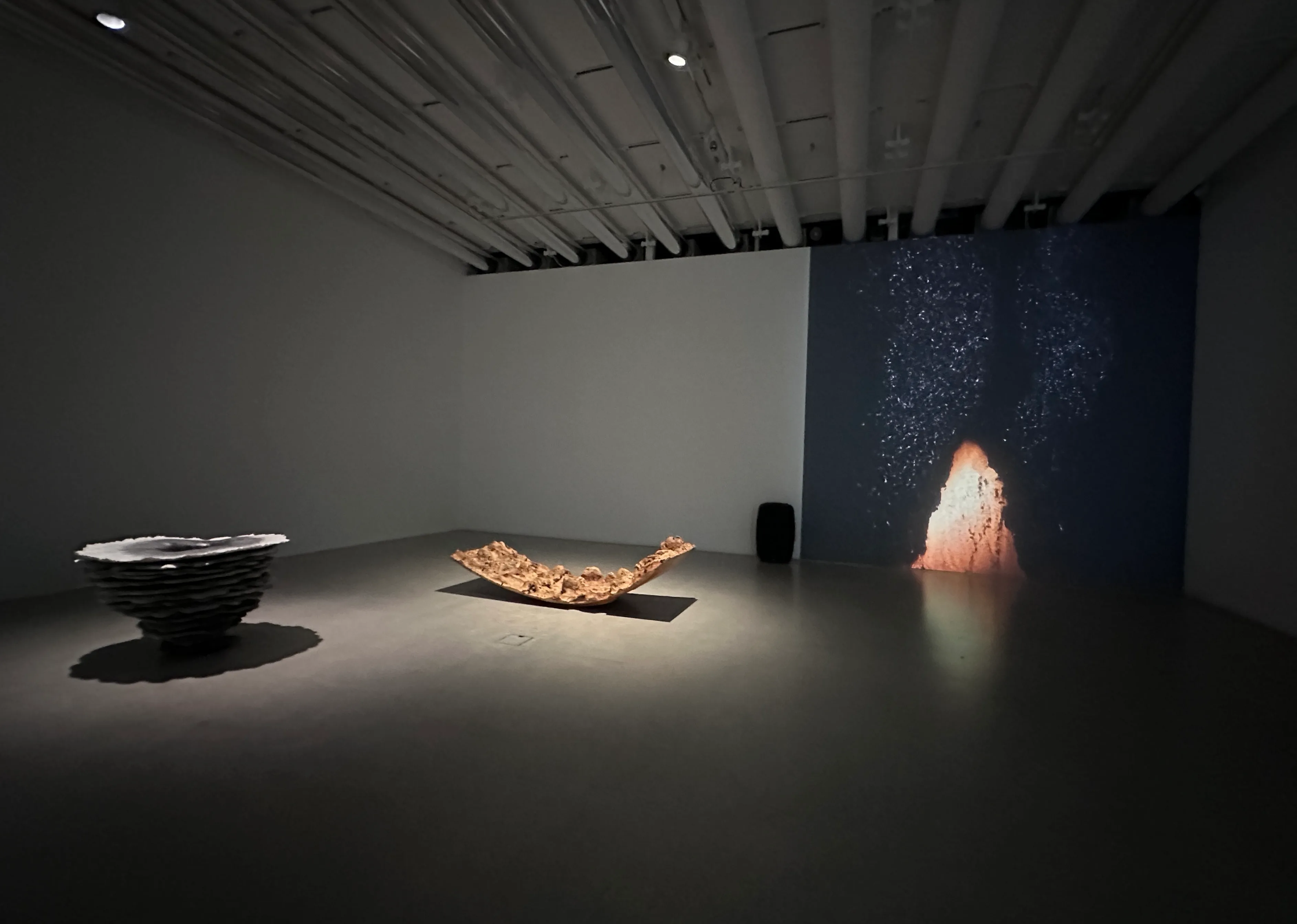 デンマークのアーティストコレクティブSUPERFLEXは作品2点を披露。なかでも《権力のトイレ デス・マスク》(2024)は、気候変動に関するあらゆる情報を発信する国連気候変動枠組条約(UNFCCC)事務局のトイレを題材に選び、金沢の土を用いて、地元作家の協力を得ながらトイレのパーツの彫刻作品を作った。それらは複製可能だが「いずれの作品も未焼成であり、いつかはぼろぼろになってしまう」と、メンバーのヤコブ・フィンガー。その二面性は、本展で展示されるマーク・マンダースの大型作品がまとう「脆さ」のイメージを彷彿とさせる。