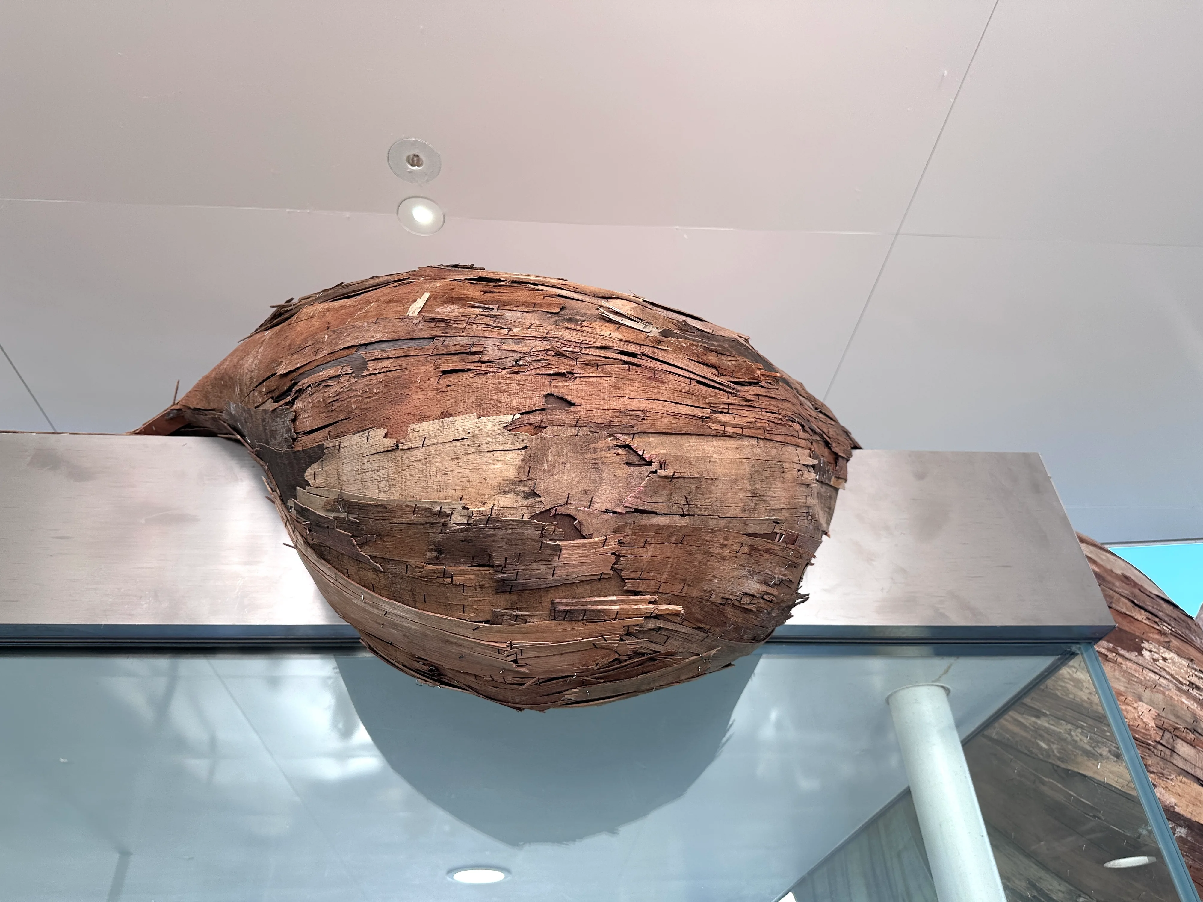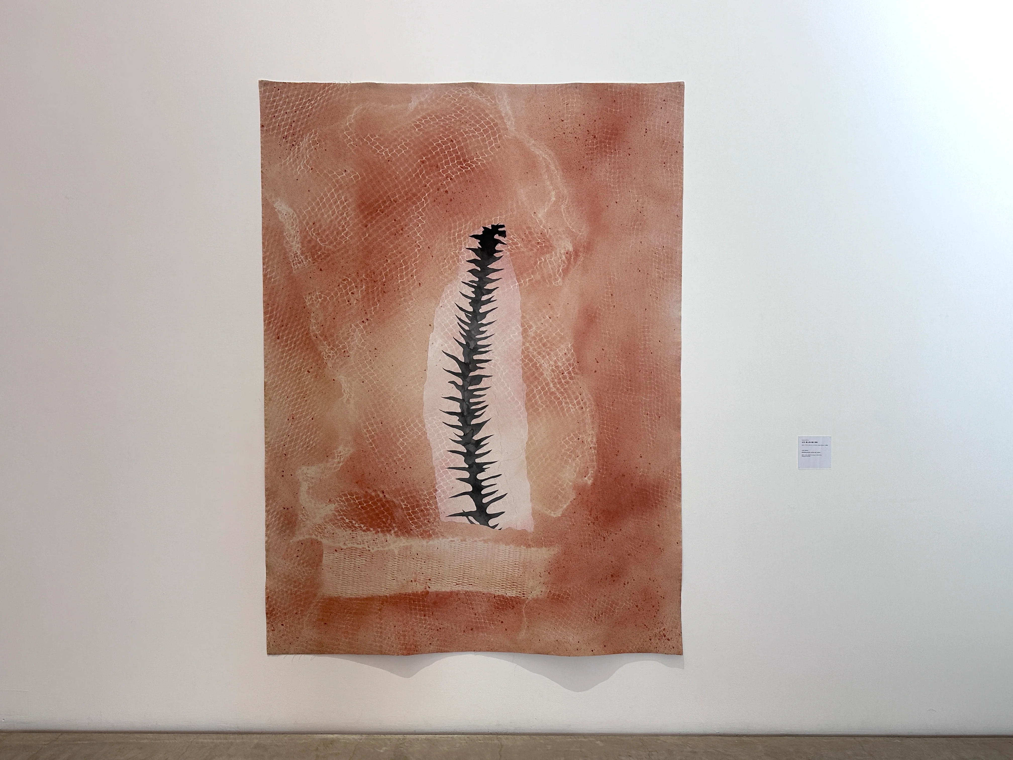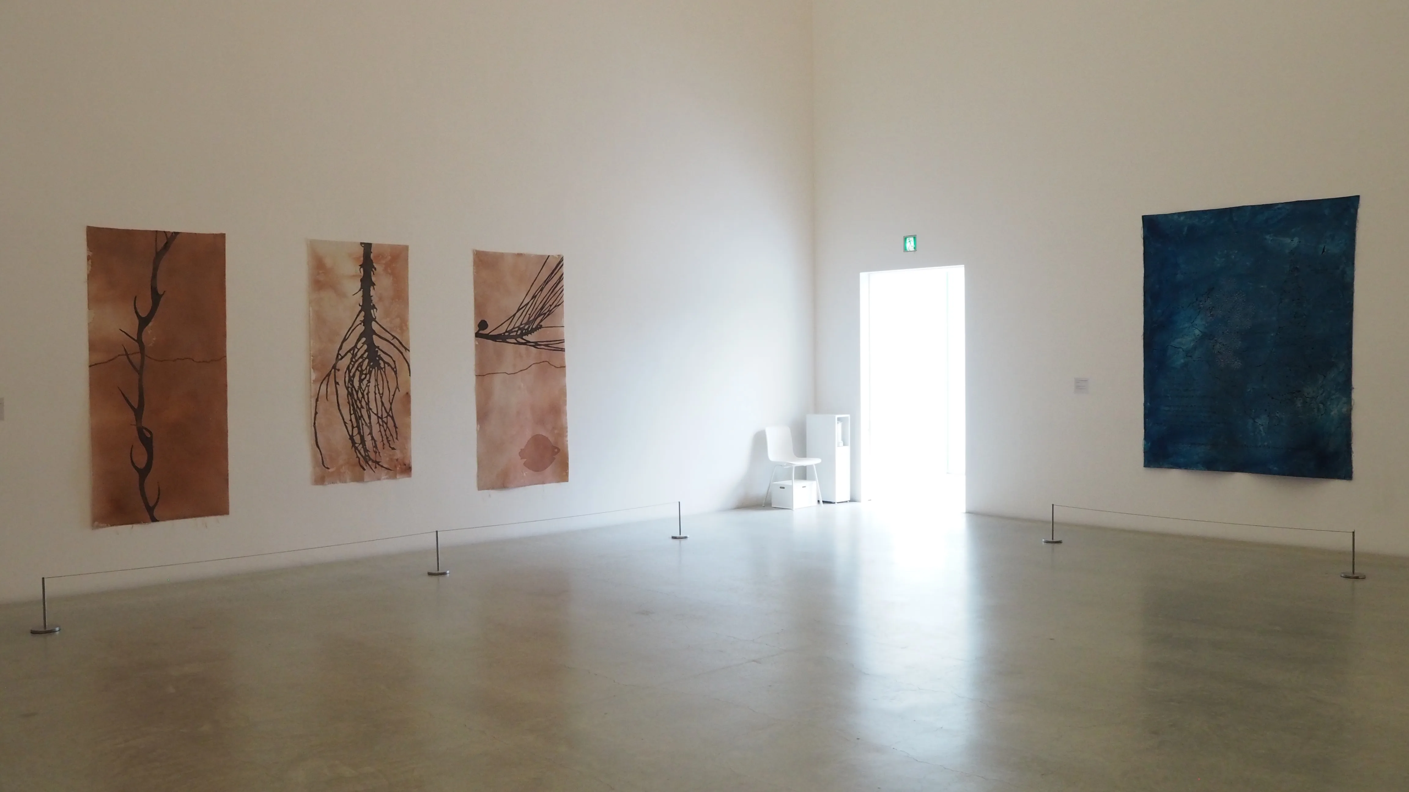 オーストラリア・クイーンズランド州北西部のワニ族の末裔であるジュディ・ワトソンは、パンデミックの時期に制作した、アボリジナルの生活や文化を参照した作品を展示。たとえば、《記憶の傷跡、フィンガーライムの根、カスアリーナ・イエロンガスタジオで見つけたオブジェ》(2020)のタイトルにある「フィンガーライム」とは何千年もの間、アボリジナルの人々が種を守ってきたオーストラリア原産の柑橘なのだそうだ。あわせて展示される《グレートアーテジアン盆地の泉、湾(泉、水)》(2019)は、入植者の影響で水が枯れてしまった泉がモチーフになっているが、このように作家は一貫して植民地主義の複雑な歴史と、それらが先住民族コミュニティへ与える影響について考えてきたのだという。