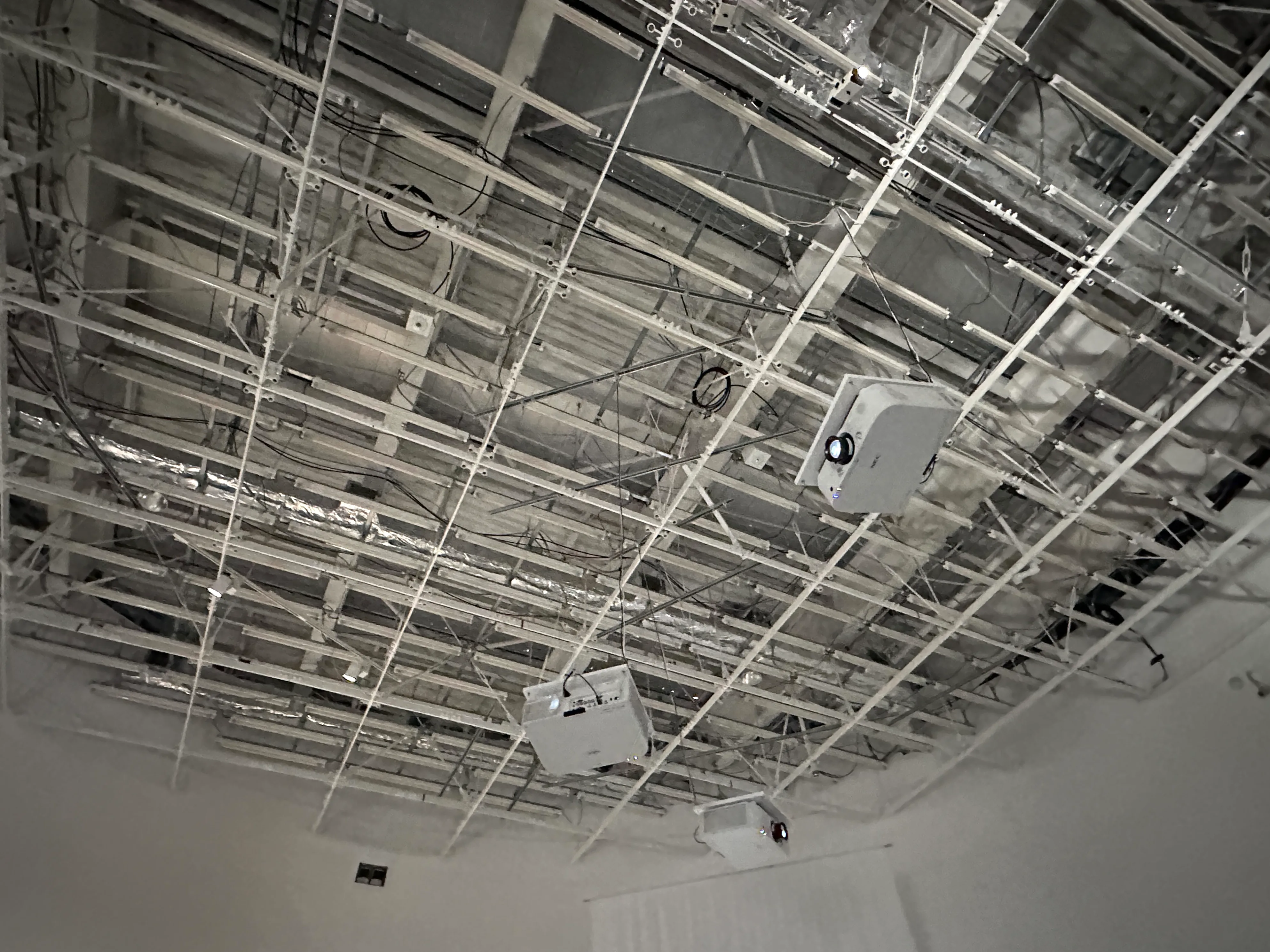 続いて、副館長の山森健直からは震災の影響でガラス製の天井のひび割れや落下、天井パネルのずれ、キャスターが破損したことなどが説明され、800枚のガラスを取り外した露出天井で活動を再開すること、老朽化に伴い2ヶ年の大規模改修作業を予定していることが明かされた。実際に展示会場を歩いてみると、これまでのクリーンな会場から一転、構造が剥き出しになった天井が痛々しく、あらためて目の前にある世界の脆さを実感するような光景があった。