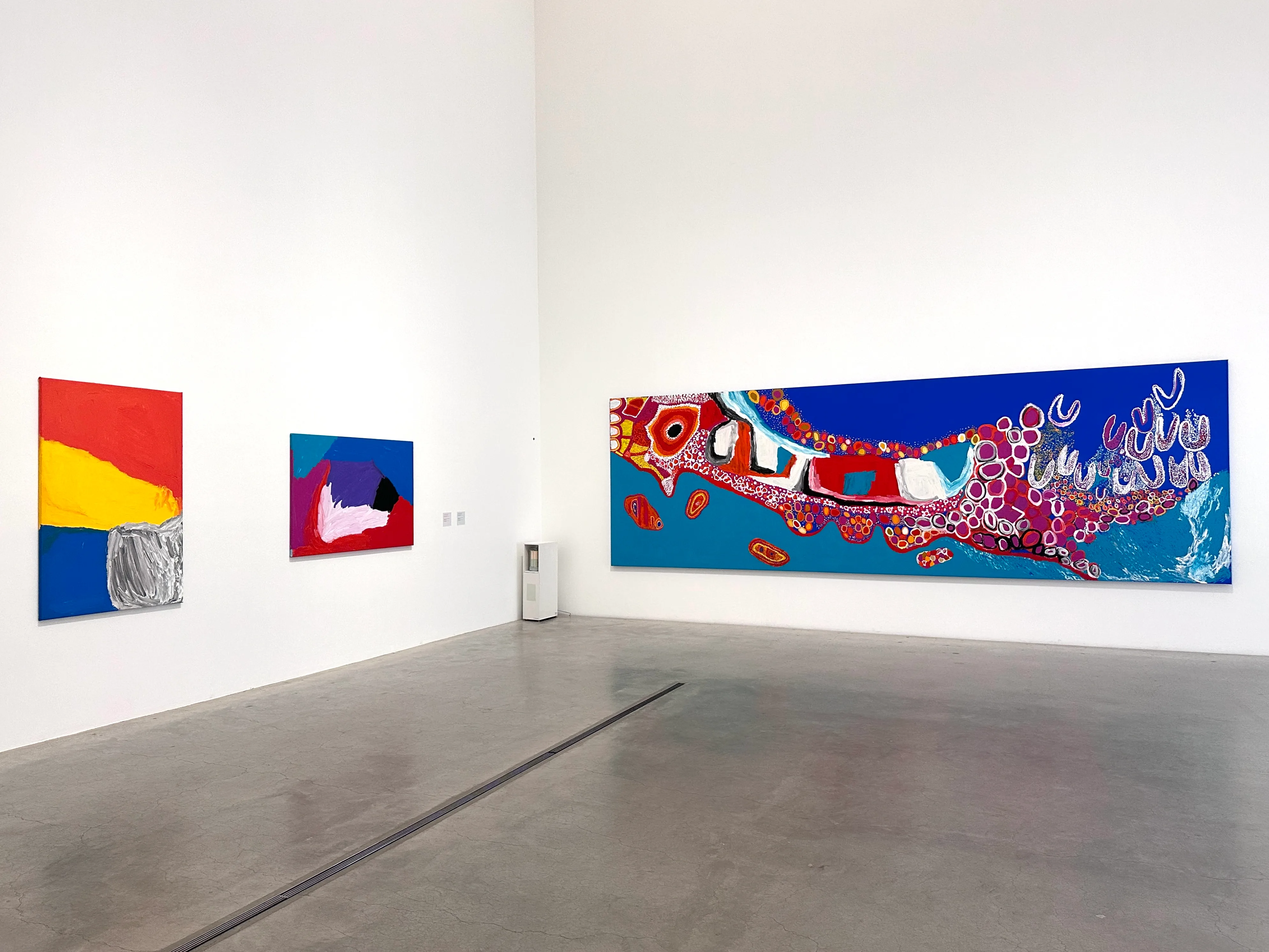ワトソンと同じくクイーンズランド州出身のアーティストで本展で唯一の物故作家は、ミルディンギンガティ・ジュワンダ・サリー・ガボリ(1924頃〜2015)。80歳から絵を描き始めたというサリー・ガボリは、出自であるカイアディルト族を中心に、アボリジナルの先祖が代々継承してきた土地、海、空を、まるで空を移動する鳥の視点から見下ろすように自由に描いた。作品群は横も縦も正位置が存在せず、キュレーターが好きなスタイルで展示できるという。アボリジナルは長きにわたって迫害され、サリー・ガボリが生きた時代も決して自由とは言えなかった。そのことを考えると、作品の持つ自由で誇り高い雰囲気に胸が詰まった。